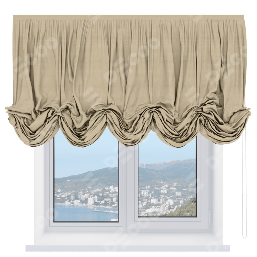 Австрийская штора производителя «Cortin», используется для проёма, пошита из ткани вельвет бежевый, артикул ткани 85538. Имеет универсальный механизм и подходит для монтажа: на потолок и на стену.