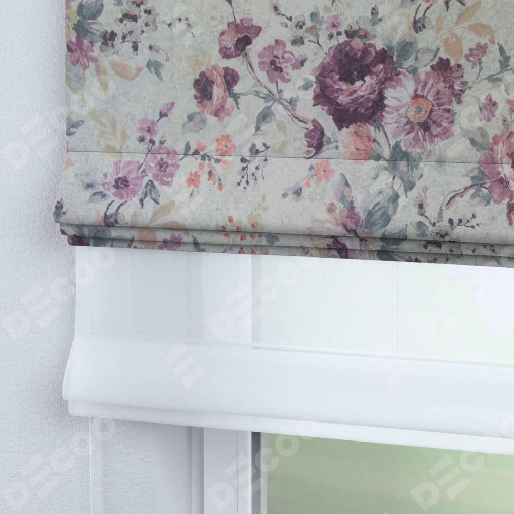 Римская штора день-ночь производителя «Cortin», используется для проёма, пошита из двух полотен, с лицевой стороны «Пионы», вторая ткань тюль (по стандарту комплектуется тюль белого цвета артикул V-01). Имеет универсальный механизм и подходит для монтажа: на потолок, на стену и в нишу.