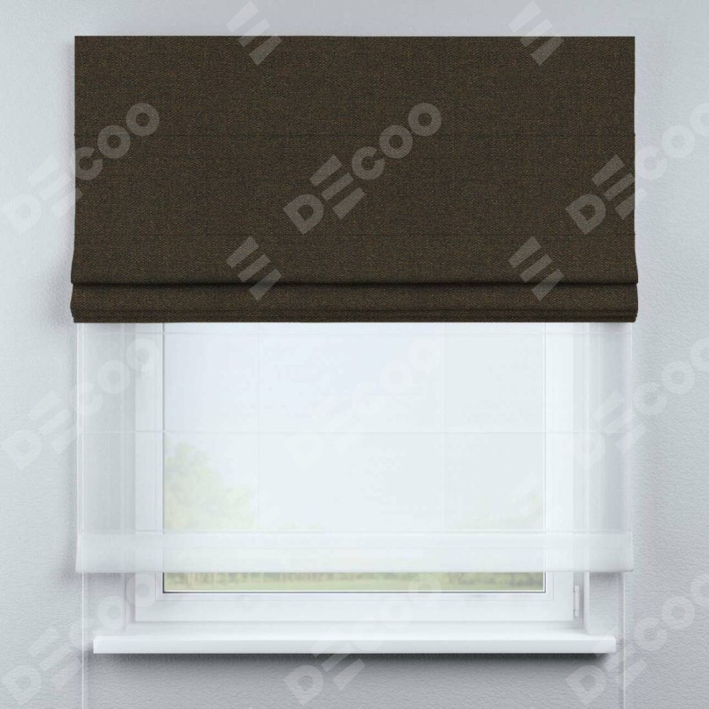 Римская штора день-ночь производителя «Cortin», используется для проёма, пошита из двух полотен, с лицевой стороны лён тёмно-коричневый артикул 53444, вторая ткань тюль (по стандарту комплектуется тюль белого цвета артикул V-01). Имеет универсальный механизм и подходит для монтажа: на потолок, на стену и в нишу.