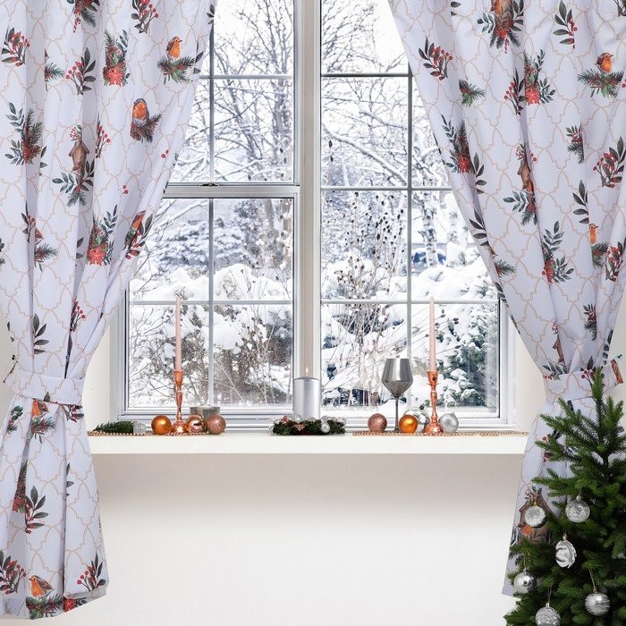 Новогодний комплект штор для кухни с подхватами «Beautiful birds» 145х180см-2 шт., габардин