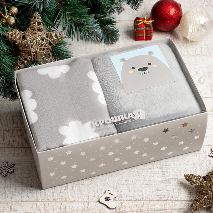 В набор входит плед 90 × 90 см и муслиновая пелёнка 75 × 120 см.