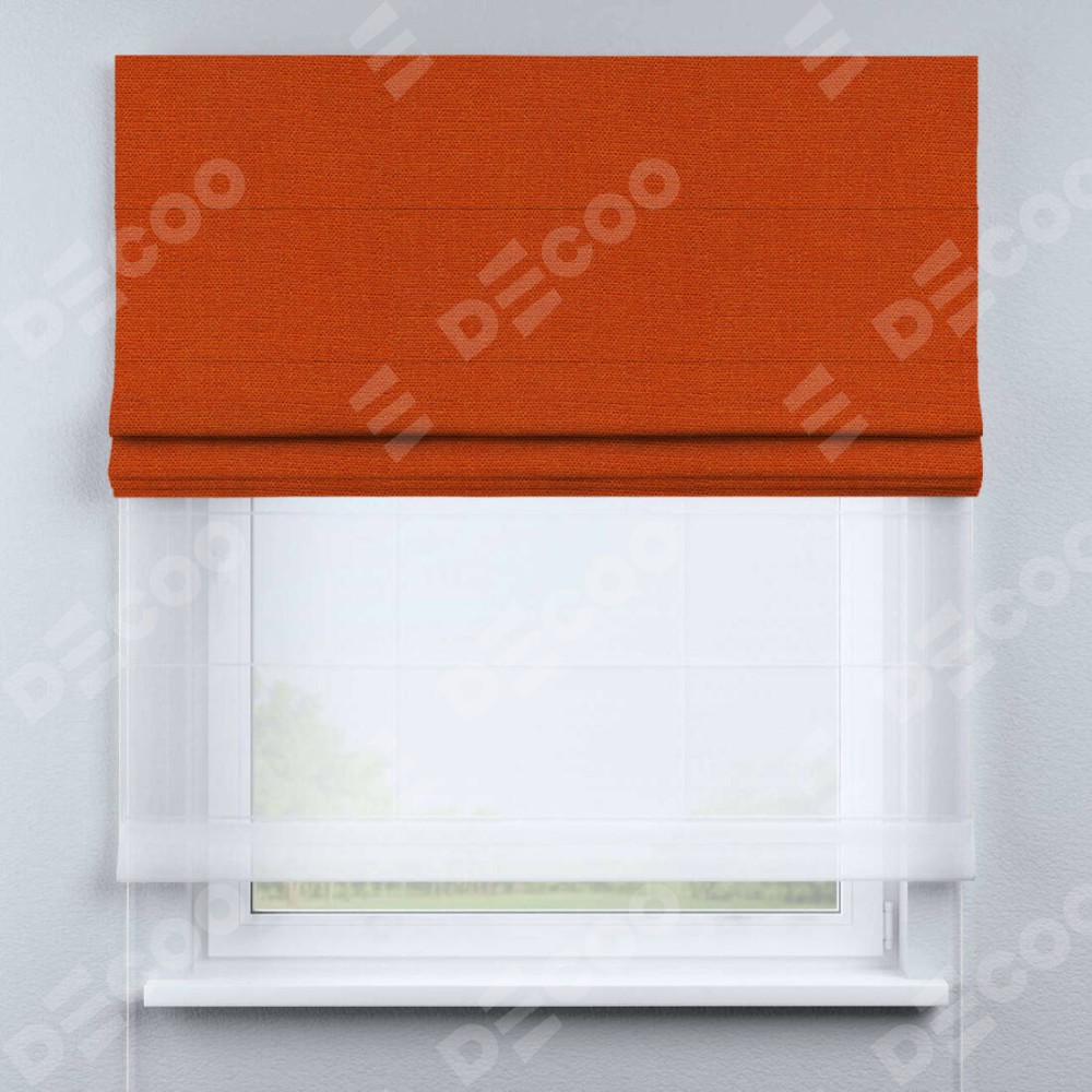 Римская штора день-ночь производителя «Cortin», используется для проёма, пошита из двух полотен, с лицевой стороны лён терракотовый артикул 53440, вторая ткань тюль (по стандарту комплектуется тюль белого цвета артикул V-01). Имеет универсальный механизм и подходит для монтажа: на потолок, на стену и в нишу.