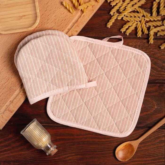 Кухонныйнабор Доляна «Полосы», прихватка20х20см, варежка12х15см, пудровый, 50%п/э, 50%хл