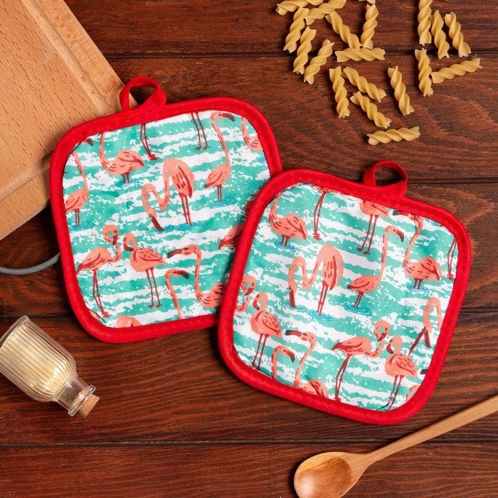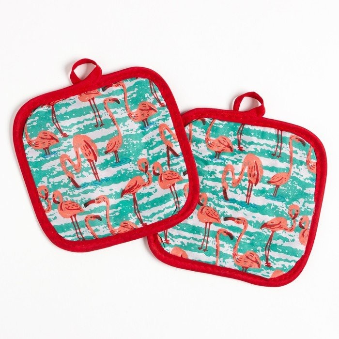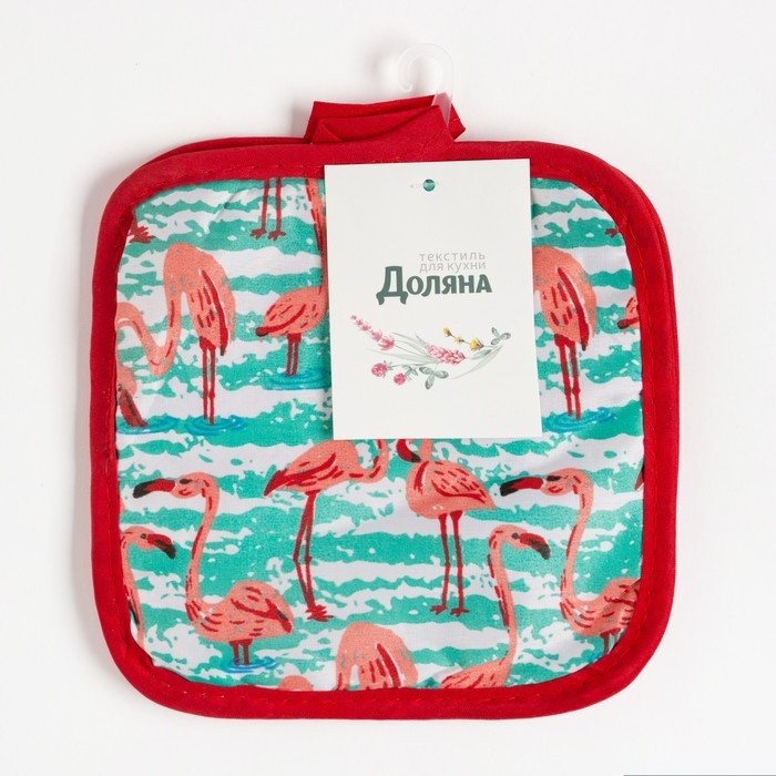 Кухонный набор (2 предмета) Доляна «Фламинго», цвет зеленый, прихватка 16×16 см — 2 шт, 100% п/э