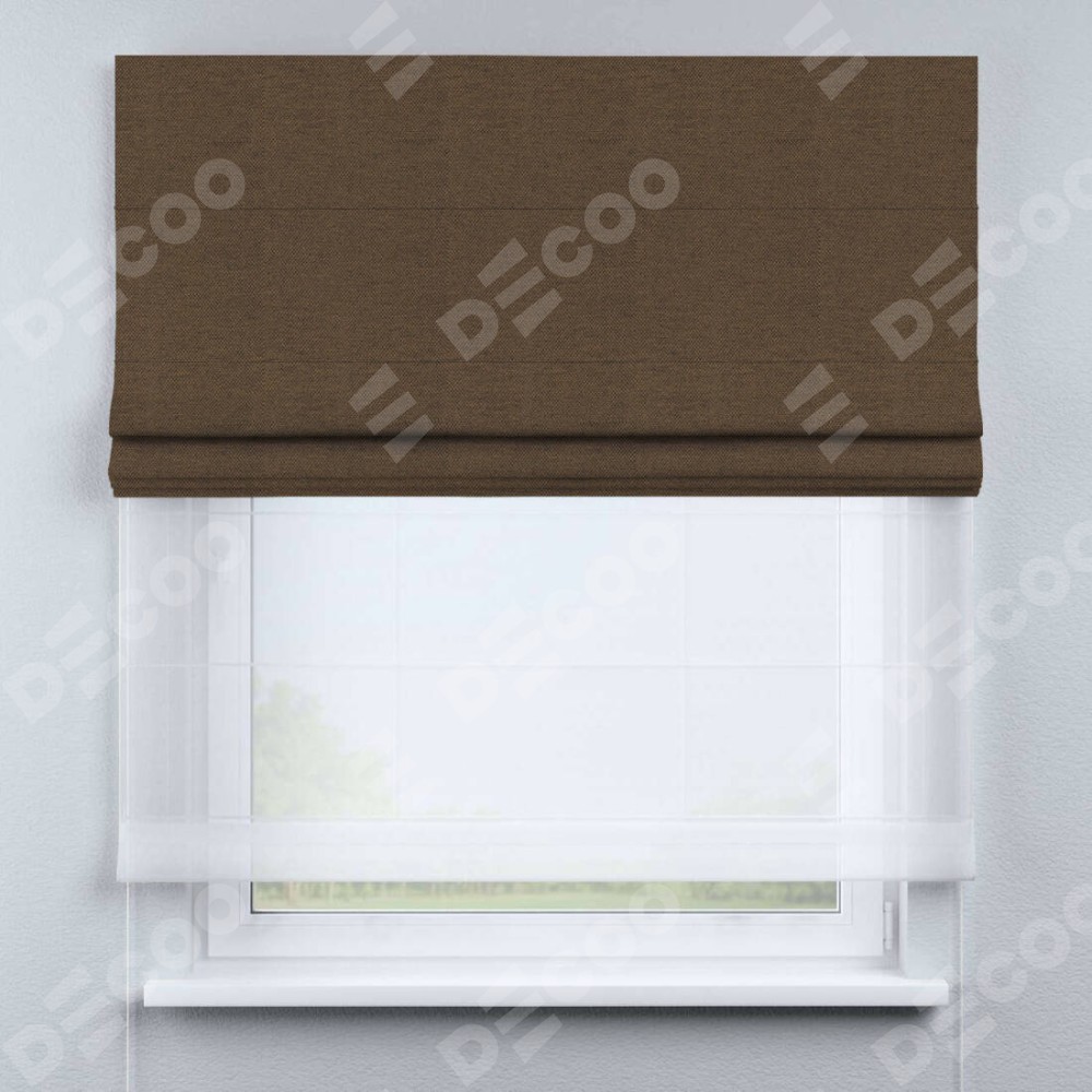 Римская штора день-ночь производителя «Cortin», используется для проёма, пошита из двух полотен, с лицевой стороны лён димаут тёмно-коричневый артикул 83030, вторая ткань тюль (по стандарту комплектуется тюль белого цвета артикул V-01). Имеет универсальный механизм и подходит для монтажа: на потолок, на стену и в нишу.