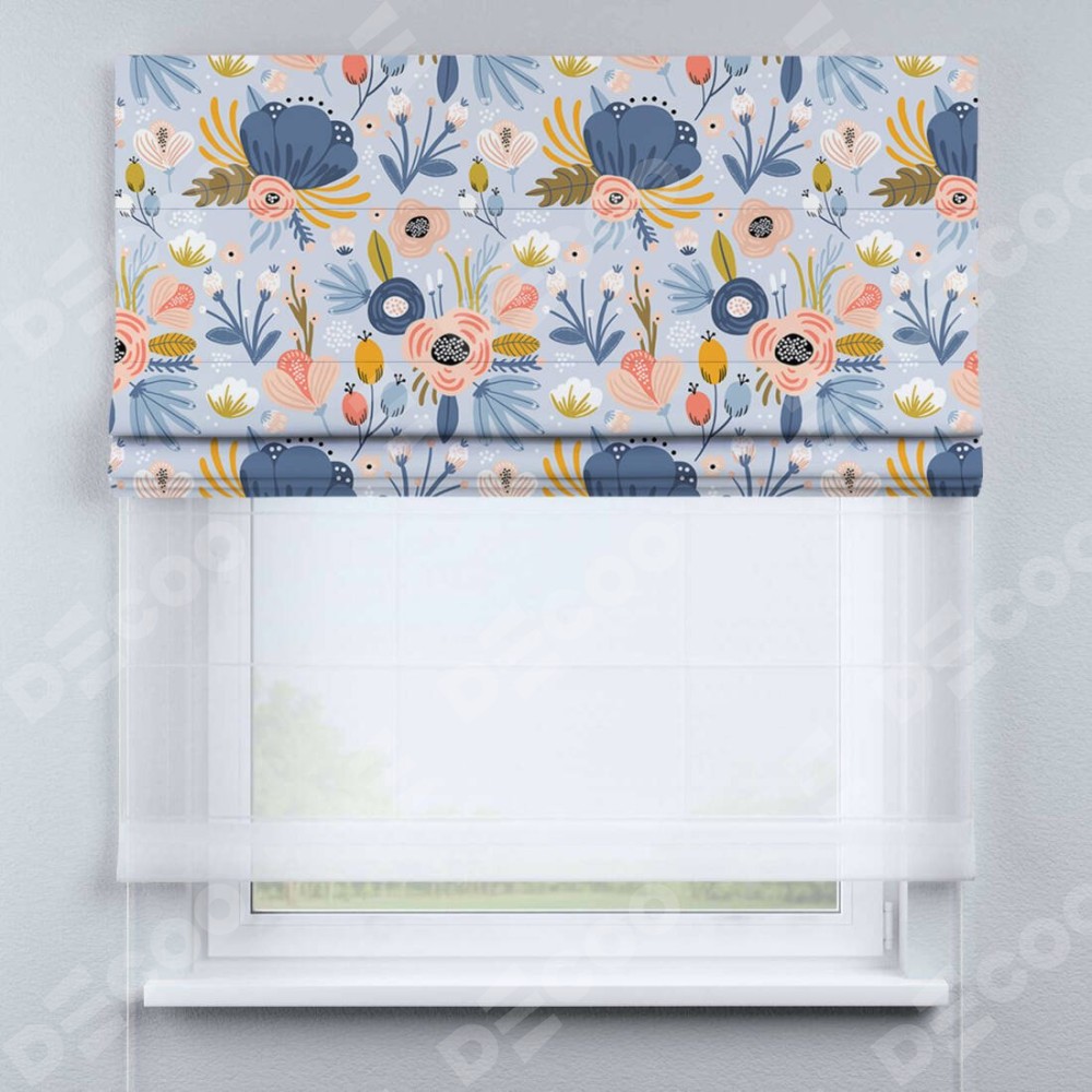Римская штора день-ночь производителя «Cortin», используется для проёма, пошита из двух полотен, с лицевой блэкаут с нанесением сублимационной печати «Волшебные цветы», вторая ткань тюль (по стандарту комплектуется тюль белого цвета артикул V-01). Имеет универсальный механизм и подходит для монтажа: на потолок, на стену и в нишу.
