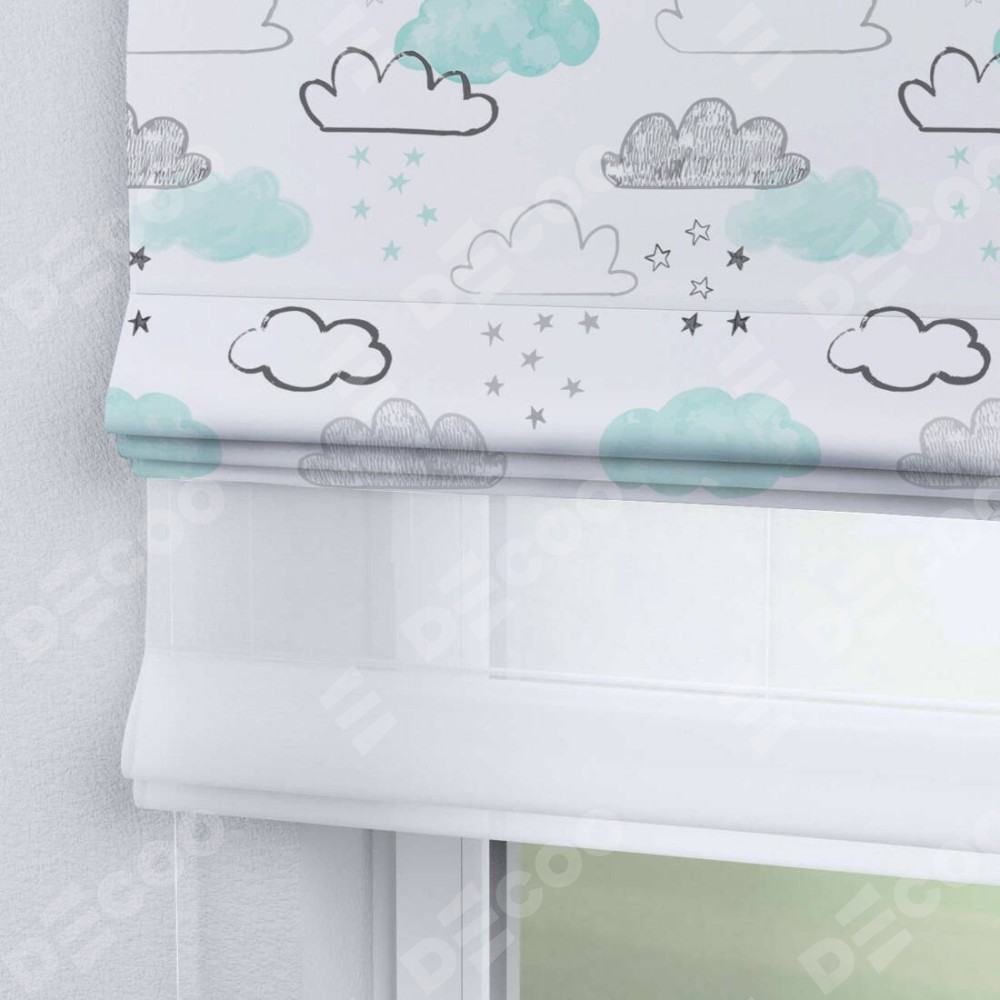 Римская штора день-ночь производителя «Cortin», используется для проёма, пошита из двух полотен, с лицевой блэкаут с нанесением сублимационной печати «Облака и звёзды», вторая ткань тюль (по стандарту комплектуется тюль белого цвета артикул V-01). Имеет универсальный механизм и подходит для монтажа: на потолок, на стену и в нишу.