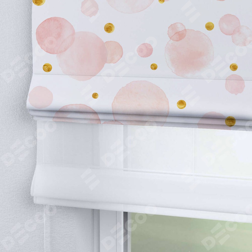 Римская штора день-ночь производителя «Cortin», используется для проёма, пошита из двух полотен, с лицевой блэкаут с нанесением сублимационной печати «Круги и точки», вторая ткань тюль (по стандарту комплектуется тюль белого цвета артикул V-01). Имеет универсальный механизм и подходит для монтажа: на потолок, на стену и в нишу.