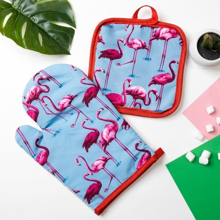 Кухонный набор (2 предмета) Доляна «Фламинго», цвет голубой, прихватка 16×16 см, рукавица 26×16 см, 100% п/э