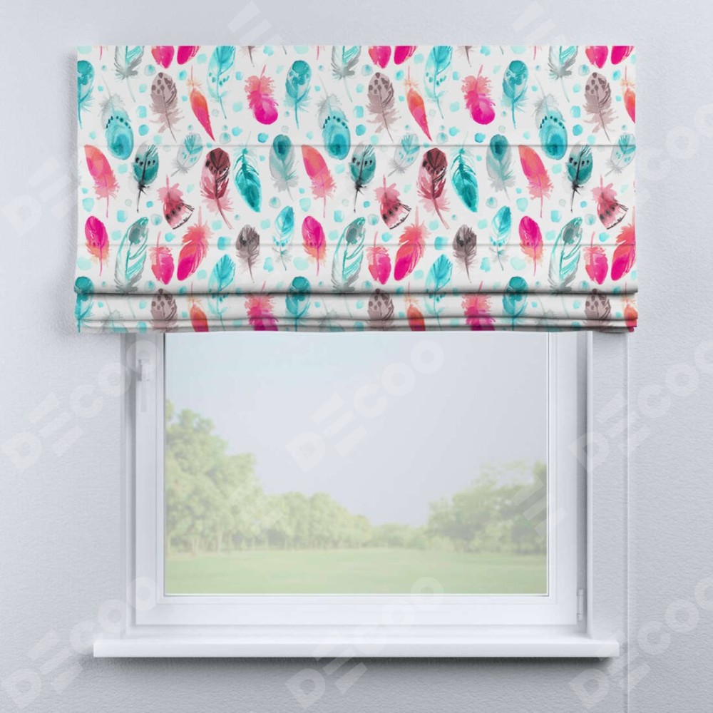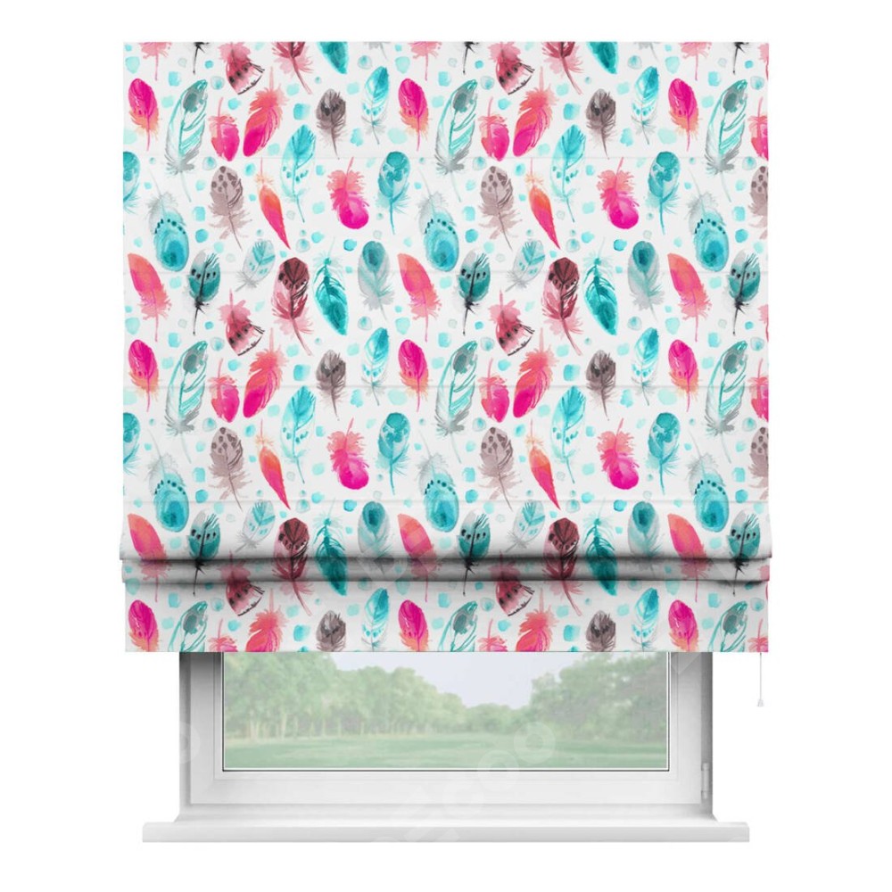 Римская штора производителя «Cortin», используется для проёма, пошита из ткани блэкаут с нанесением сублимационной печати «Перья». Имеет универсальный механизм и подходит для монтажа: на потолок, на стену и в нишу.