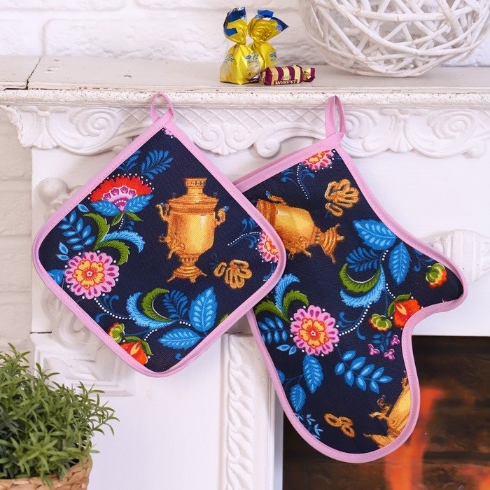 Набор кухонный (Варежка 26*30 см+прихватка 18*18 см) Самовары, синий, рогожка, хл 100%