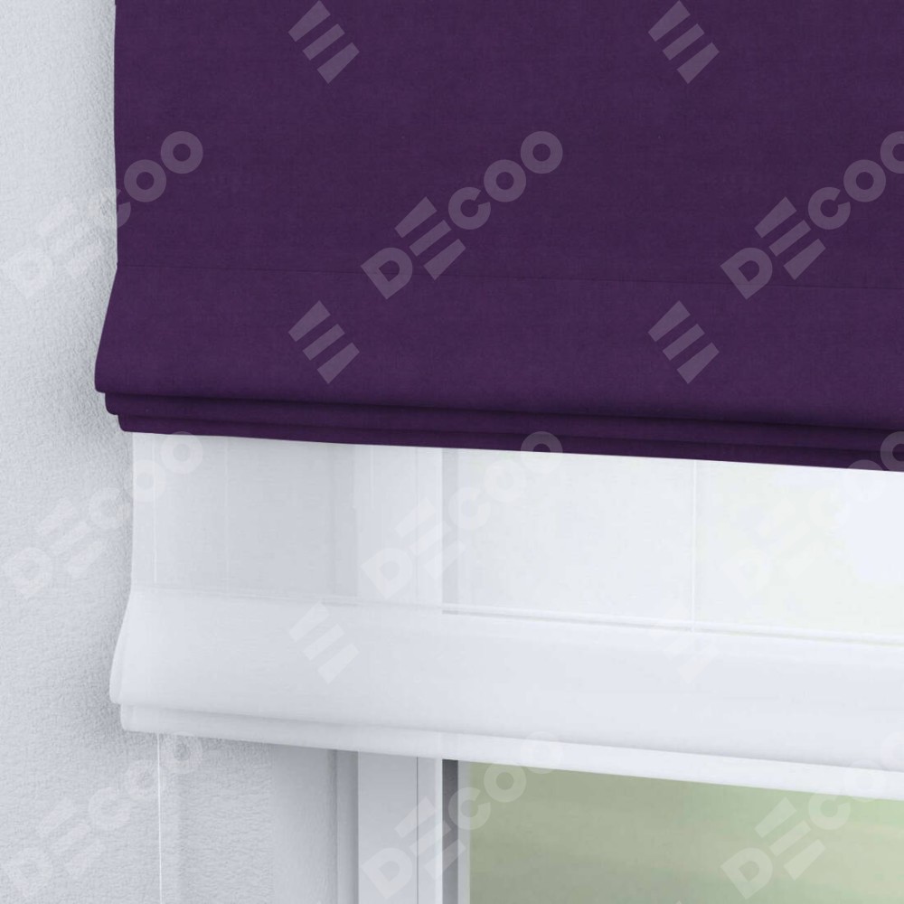 Римская штора день-ночь производителя «Cortin», используется для проёма, пошита из двух полотен, с лицевой стороны вельвет тёмно-фиолетовый артикул 17753, вторая ткань тюль (по стандарту комплектуется тюль белого цвета артикул V-01). Имеет универсальный механизм и подходит для монтажа: на потолок, на стену и в нишу.