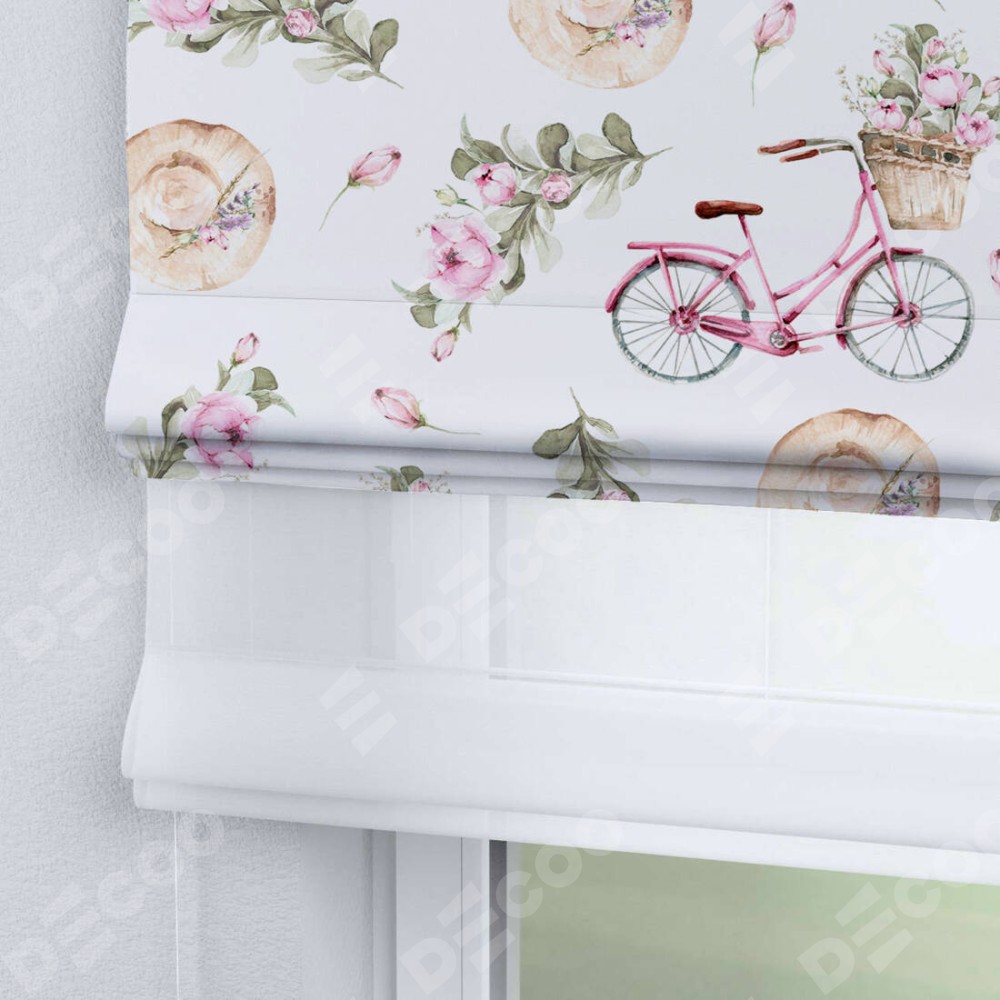 Римская штора день-ночь производителя «Cortin», используется для проёма, пошита из двух полотен, с лицевой блэкаут с нанесением сублимационной печати «Розовый велосипед», вторая ткань тюль (по стандарту комплектуется тюль белого цвета артикул V-01). Имеет универсальный механизм и подходит для монтажа: на потолок, на стену и в нишу.