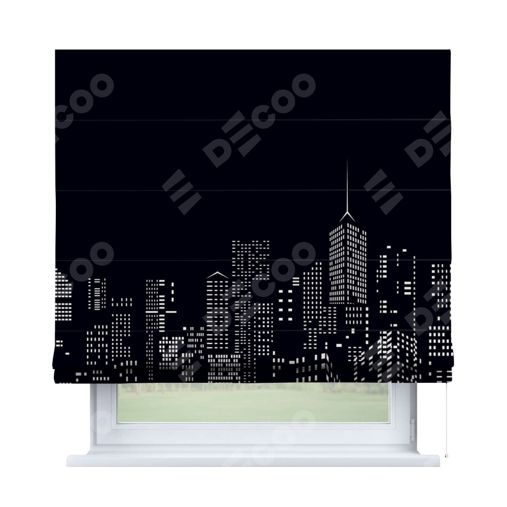 Римская штора производителя «Cortin», используется для проёма, пошита из ткани блэкаут с нанесением сублимационной печати «Ночной город». Имеет универсальный механизм и подходит для монтажа: на потолок, на стену и в нишу.