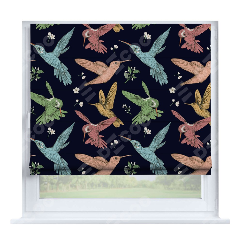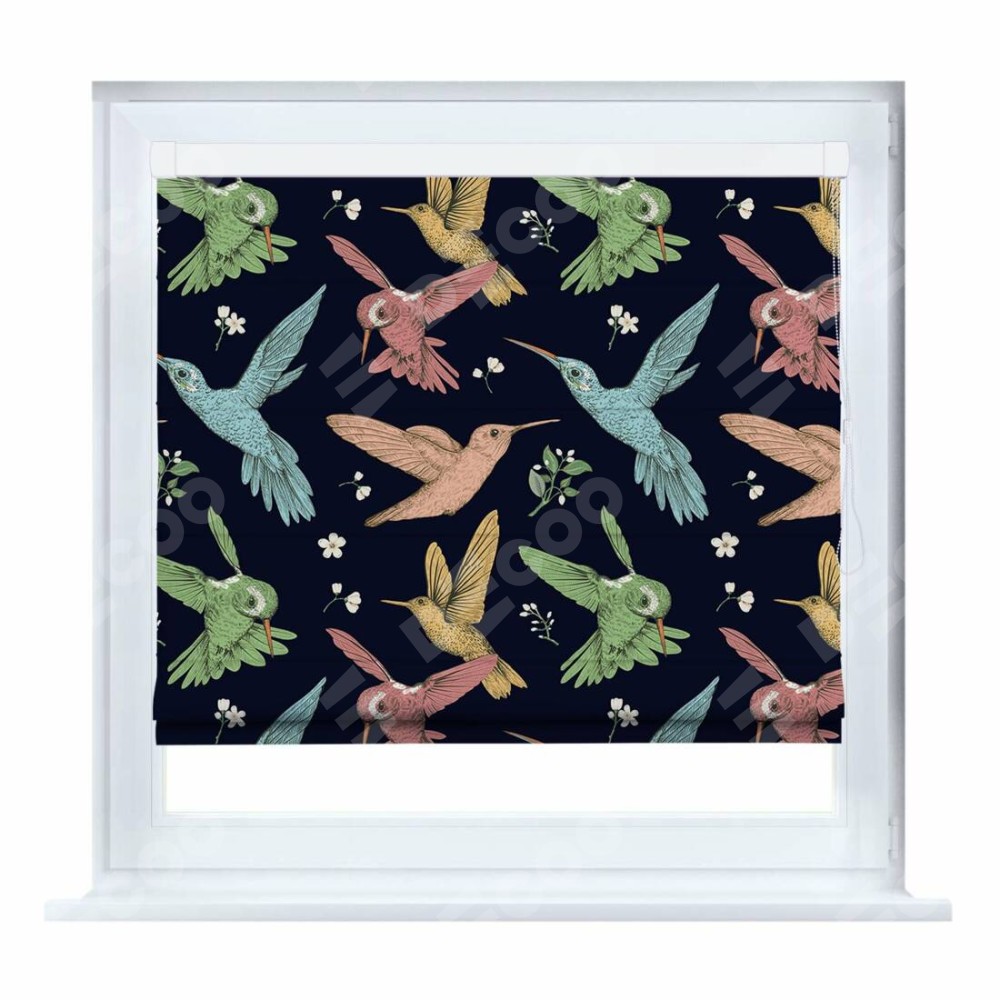 Римская штора производителя «Cortin», устанавливается на створку окна, пошита из ткани блэкаут с нанесением сублимационной печати «Птицы и цветы». Штора шьётся по индивидуальным размерам, для данного типа римской шторы возможная ширина от 35 до 150 см., высота до 250 см.