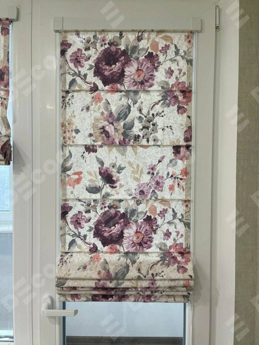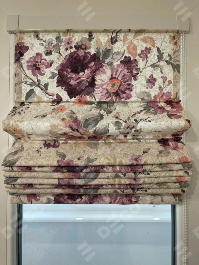 Римская штора производителя «Cortin», устанавливается на створку окна, пошита из ткани «Пионы». Штора шьётся по индивидуальным размерам, для данного типа римской шторы возможная ширина от 35 до 150 см., высота до 250 см.