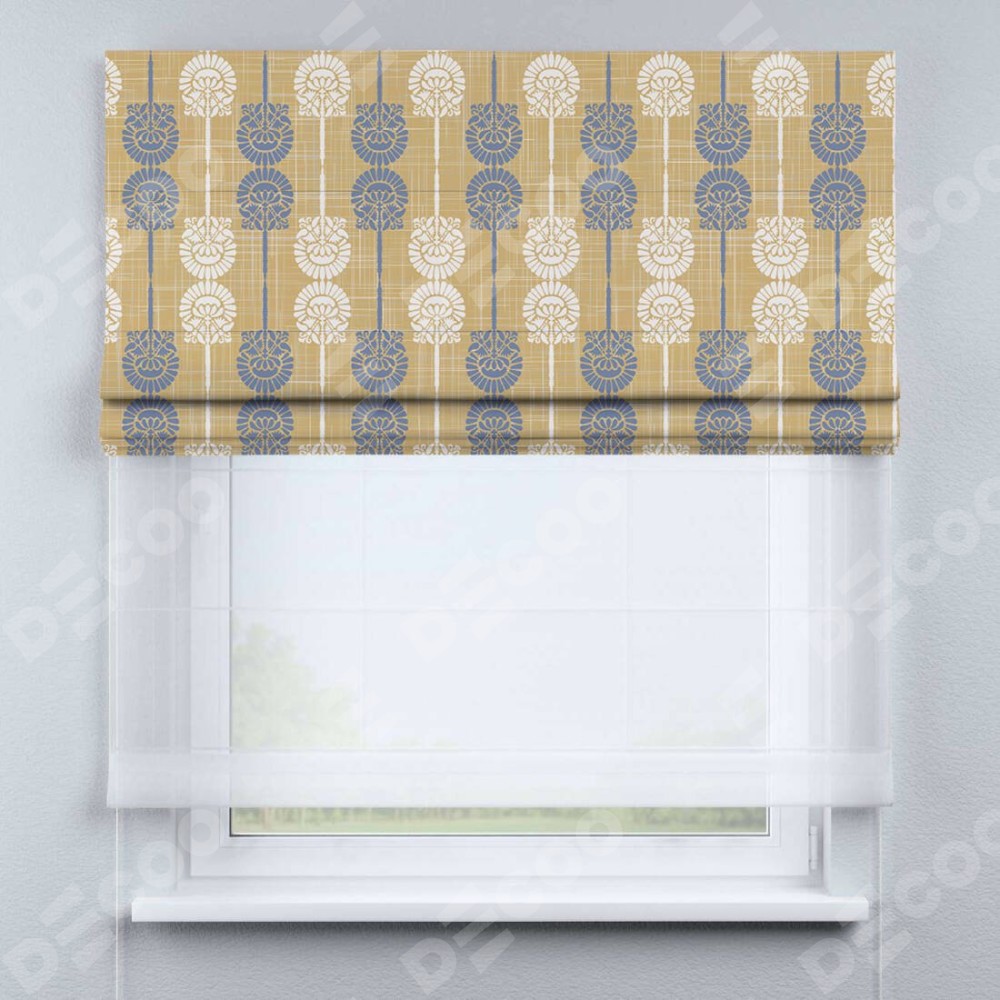 Римская штора день-ночь производителя «Cortin», используется для проёма, пошита из двух полотен, с лицевой блэкаут с нанесением сублимационной печати «Венок из ромашки», вторая ткань тюль (по стандарту комплектуется тюль белого цвета артикул V-01). Имеет универсальный механизм и подходит для монтажа: на потолок, на стену и в нишу.
