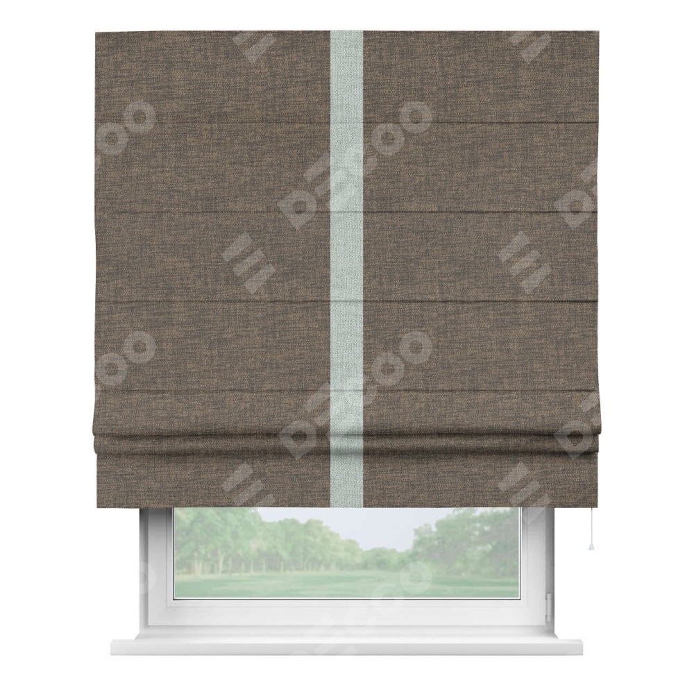 Римская штора производителя «Cortin», используется для проёма, пошита из ткани рогожка димаут коричневый, артикул 80420. Отделка шторы кантом «Хайвэй», ткань для канта используется из рогожки димаут разной расцветки на выбор. Имеет универсальный механизм и подходит для монтажа: на потолок, на стену и в нишу.
