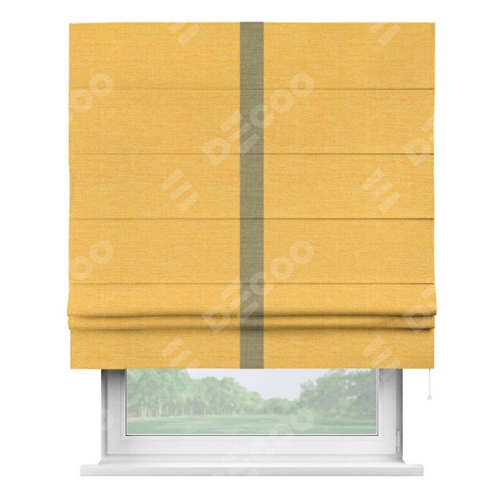 Римская штора производителя «Cortin», используется для проёма, пошита из ткани лён желтый, артикул 63738. Отделка шторы кантом «Хайвэй», ткань для канта используется из льна разной расцветки на выбор. Имеет универсальный механизм и подходит для монтажа: на потолок, на стену и в нишу.