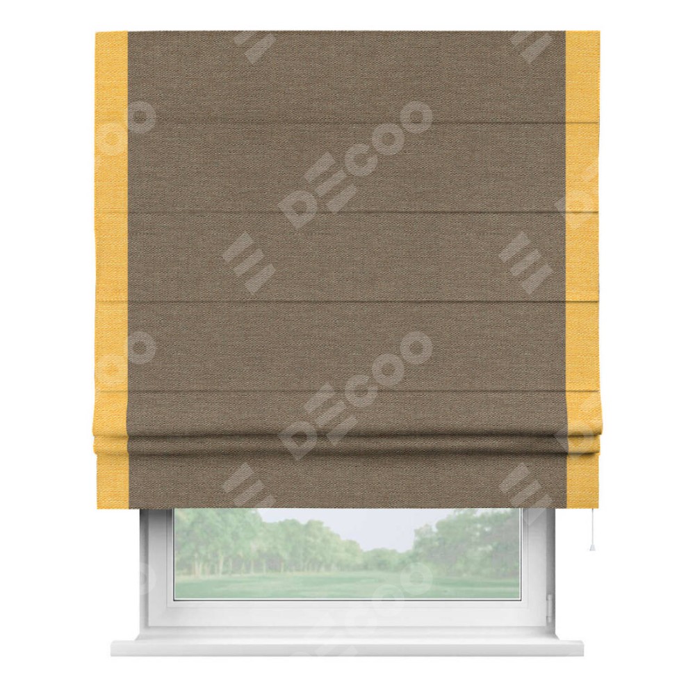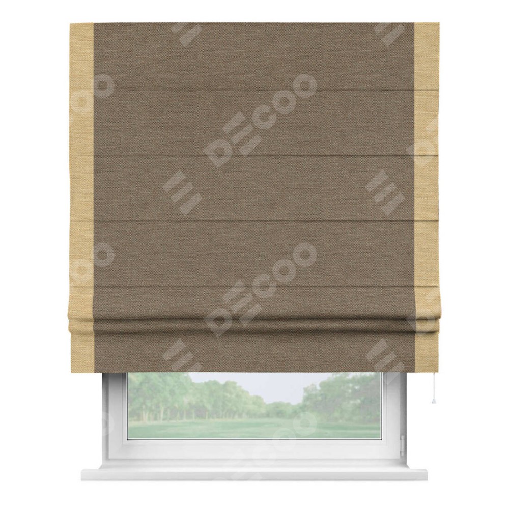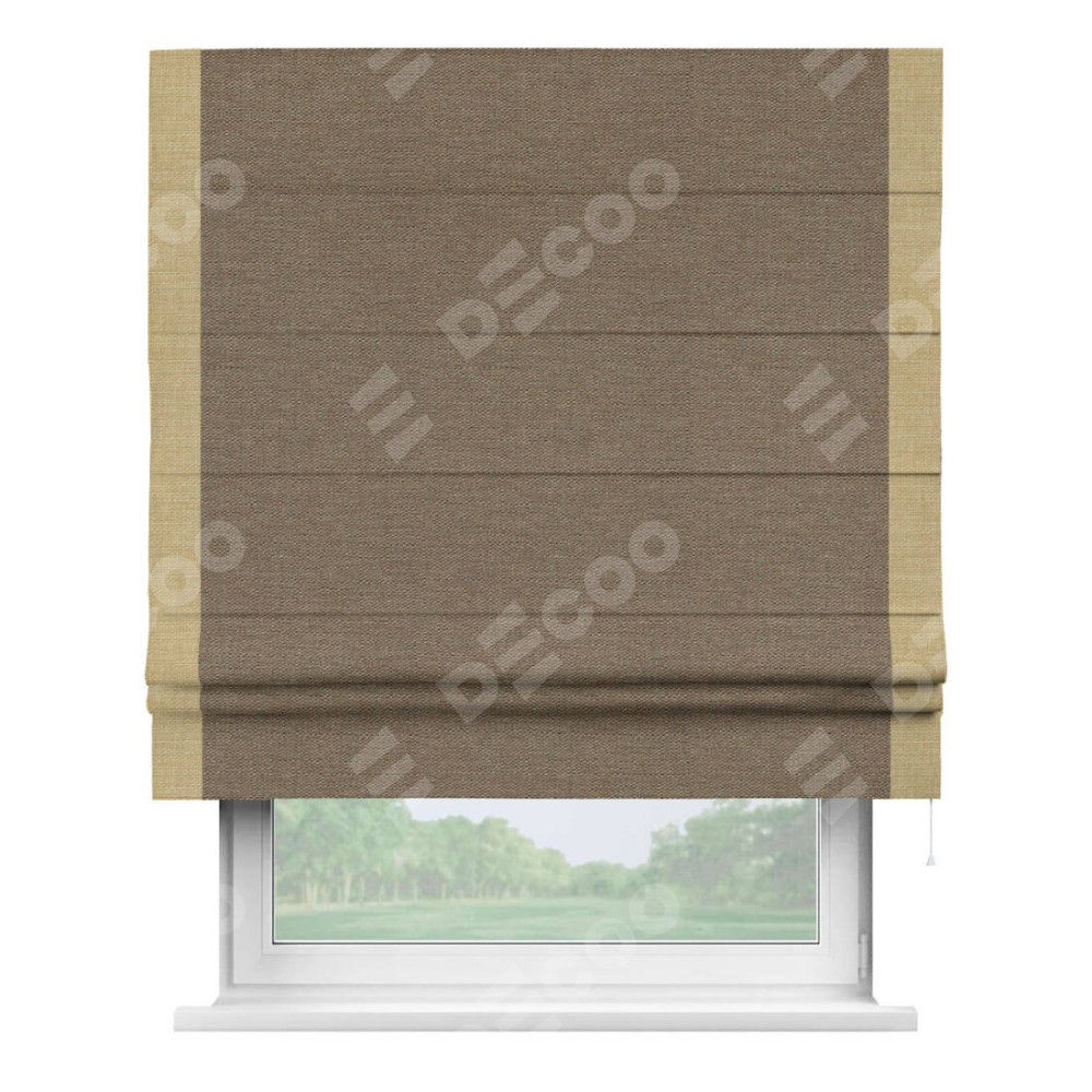 Римская штора производителя «Cortin», используется для проёма, пошита из ткани лён светло-коричневый, артикул 53434. Отделка шторы кантом «Стрим Дуо», ткань для канта используется из льна разной расцветки на выбор. Имеет универсальный механизм и подходит для монтажа: на потолок, на стену и в нишу.