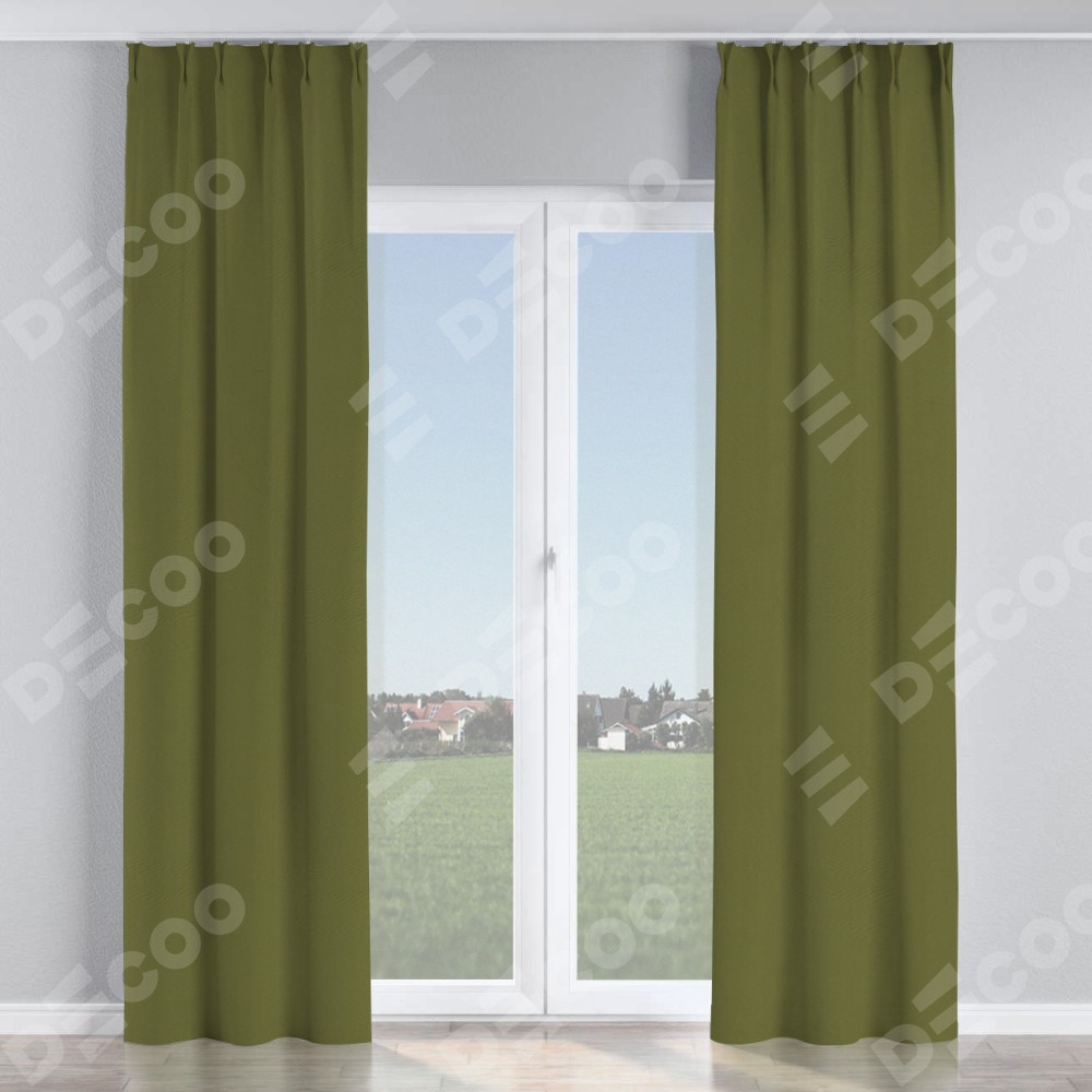 Комплект прямых штор, от производителя «Cortin», пошиты из ткани блэкаут однотонный зелёный, артикул ткани 81859. С изнаночной стороны в верхней части штор пристрачивается шторная лента с декоративными складками «Кустик». Для создания элегантных складок прямые шторы шьются по стандарту с коэффициентом 1:2 (на 100 см. ширины проёма 200 см. ширины ткани).