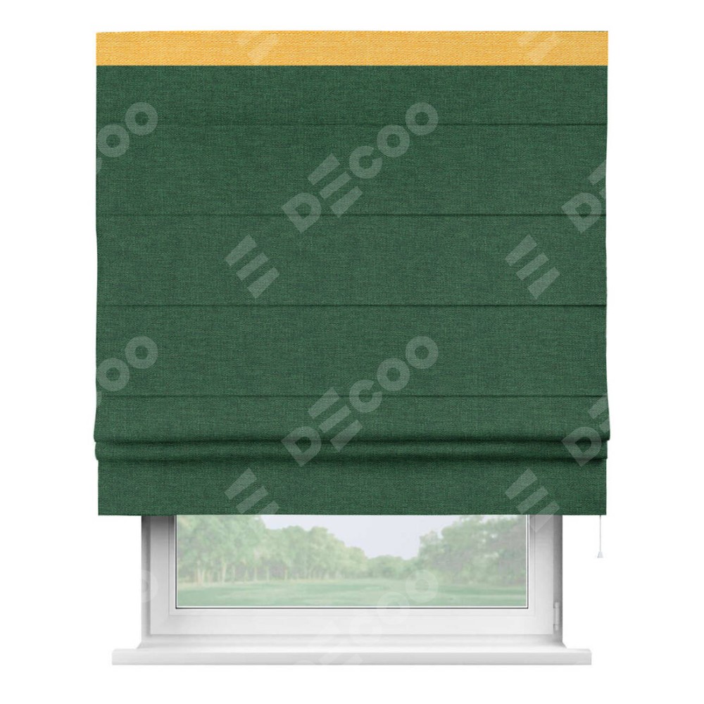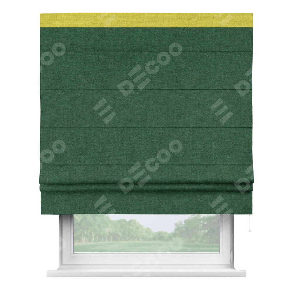 Римская штора производителя «Cortin», используется для проёма, пошита из ткани лён серо-зеленый, артикул 63740. Отделка шторы кантом «Кинг», ткань для канта используется из льна разной расцветки на выбор. Имеет универсальный механизм и подходит для монтажа: на потолок, на стену и в нишу.