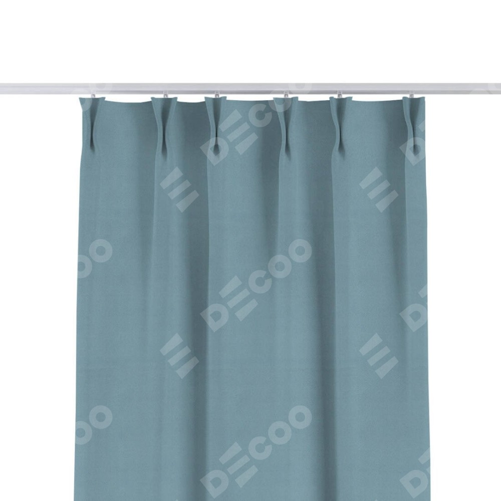 Комплект прямых штор, от производителя «Cortin», пошиты из ткани блэкаут однотонный серо-голубой, артикул ткани 29327. С изнаночной стороны в верхней части штор пристрачивается шторная лента с декоративными складками «Кустик». Для создания элегантных складок прямые шторы шьются по стандарту с коэффициентом 1:2 (на 100 см. ширины проёма 200 см. ширины ткани).
