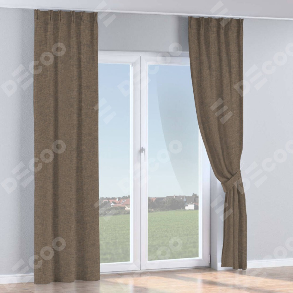 Комплект прямых штор, от производителя «Cortin», пошиты из ткани рогожка димаут коричневый, артикул ткани 80420. С изнаночной стороны в верхней части штор пристрачивается шторная лента с декоративными складками «Кустик». Для создания элегантных складок прямые шторы шьются по стандарту с коэффициентом 1:2 (на 100 см. ширины проёма 200 см. ширины ткани).