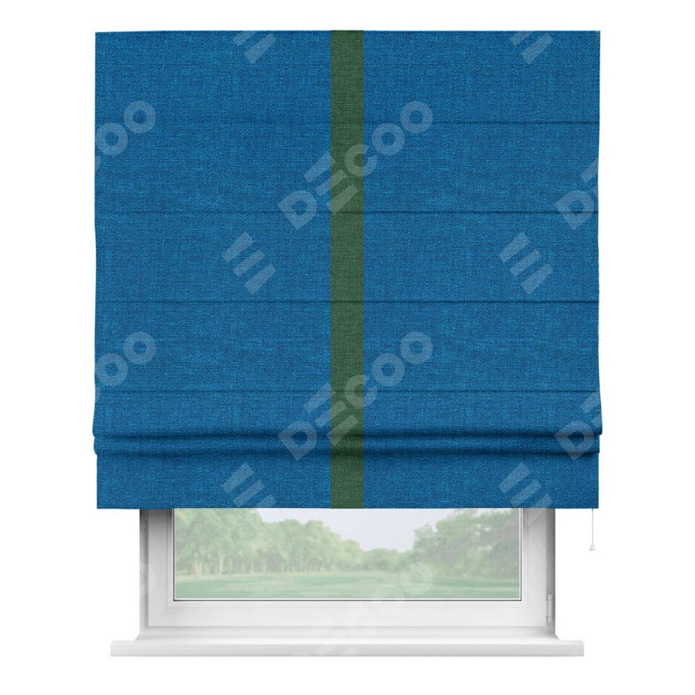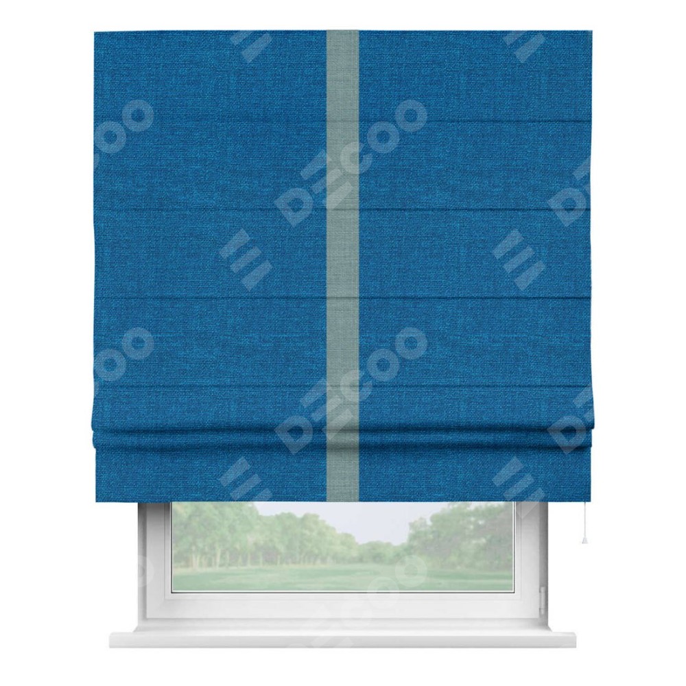 Римская штора производителя «Cortin», используется для проёма, пошита из ткани лён синий, артикул 63742. Отделка шторы кантом «Хайвэй», ткань для канта используется из льна разной расцветки на выбор. Имеет универсальный механизм и подходит для монтажа: на потолок, на стену и в нишу.