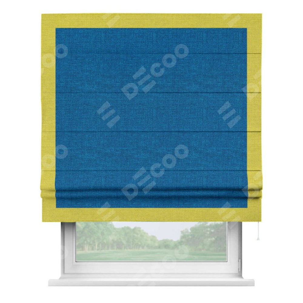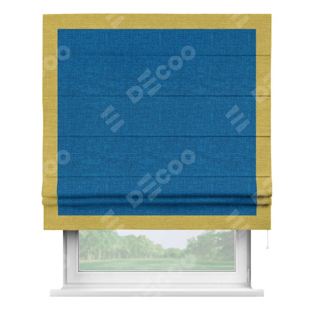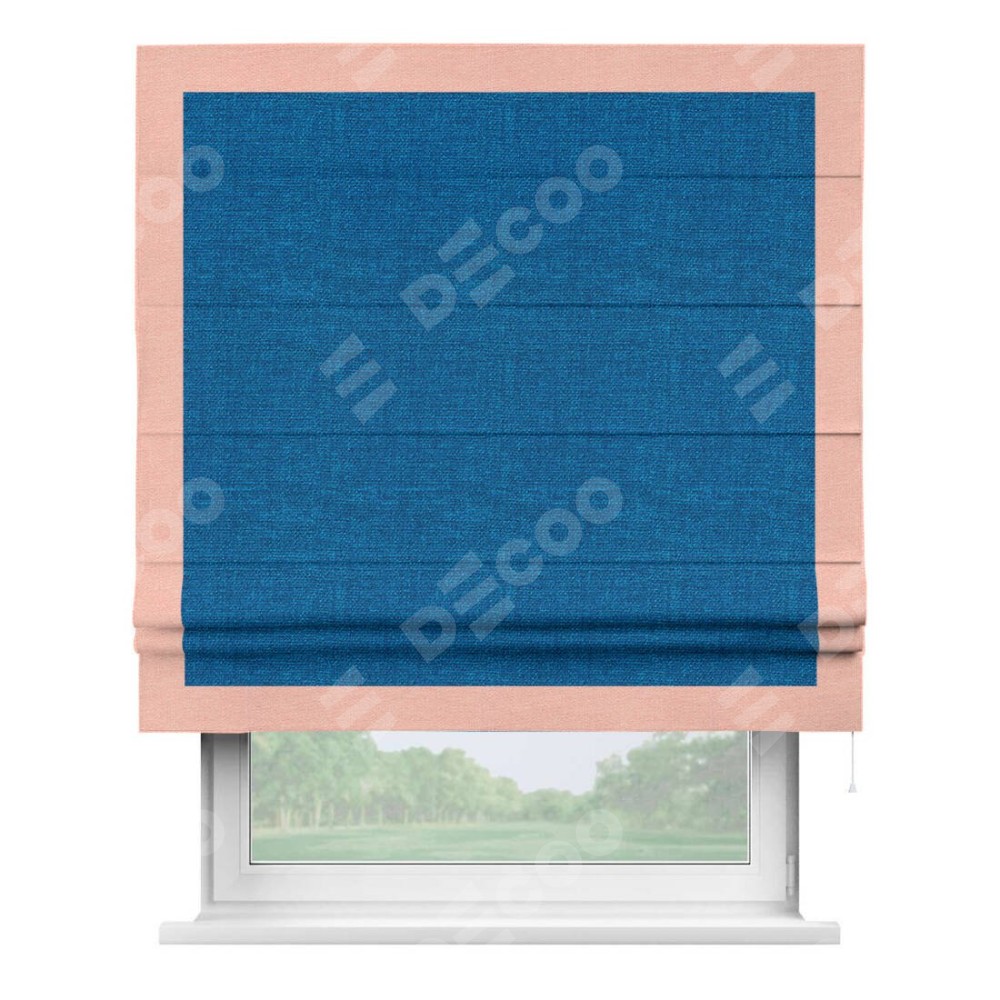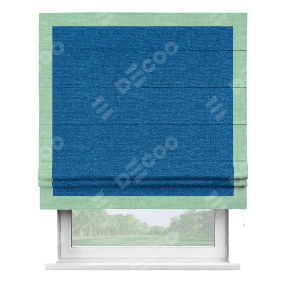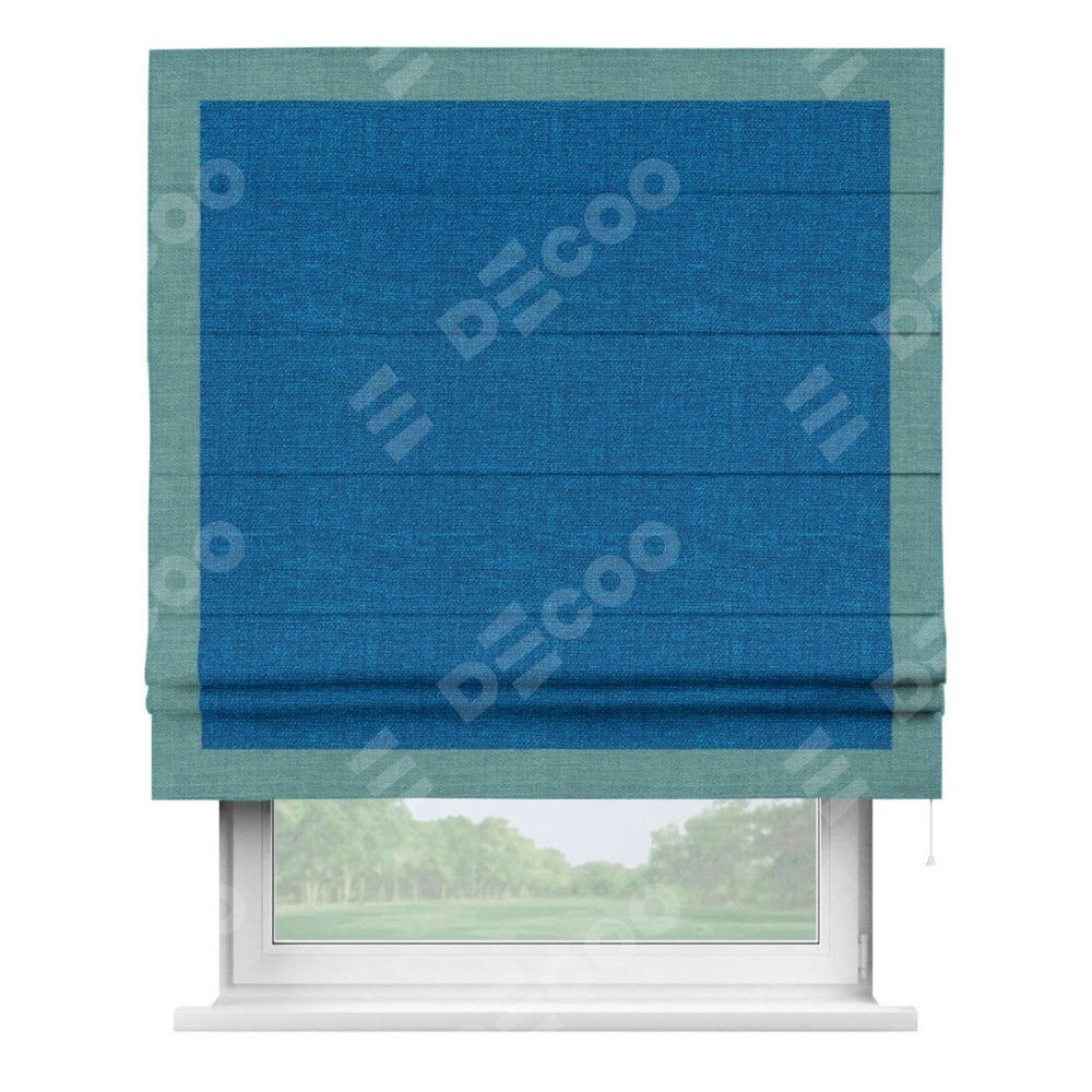 Римская штора производителя «Cortin», используется для проёма, пошита из ткани лён синий, артикул 63742. Отделка шторы кантом «Чесс», ткань для канта используется из льна разной расцветки на выбор. Имеет универсальный механизм и подходит для монтажа: на потолок, на стену и в нишу.