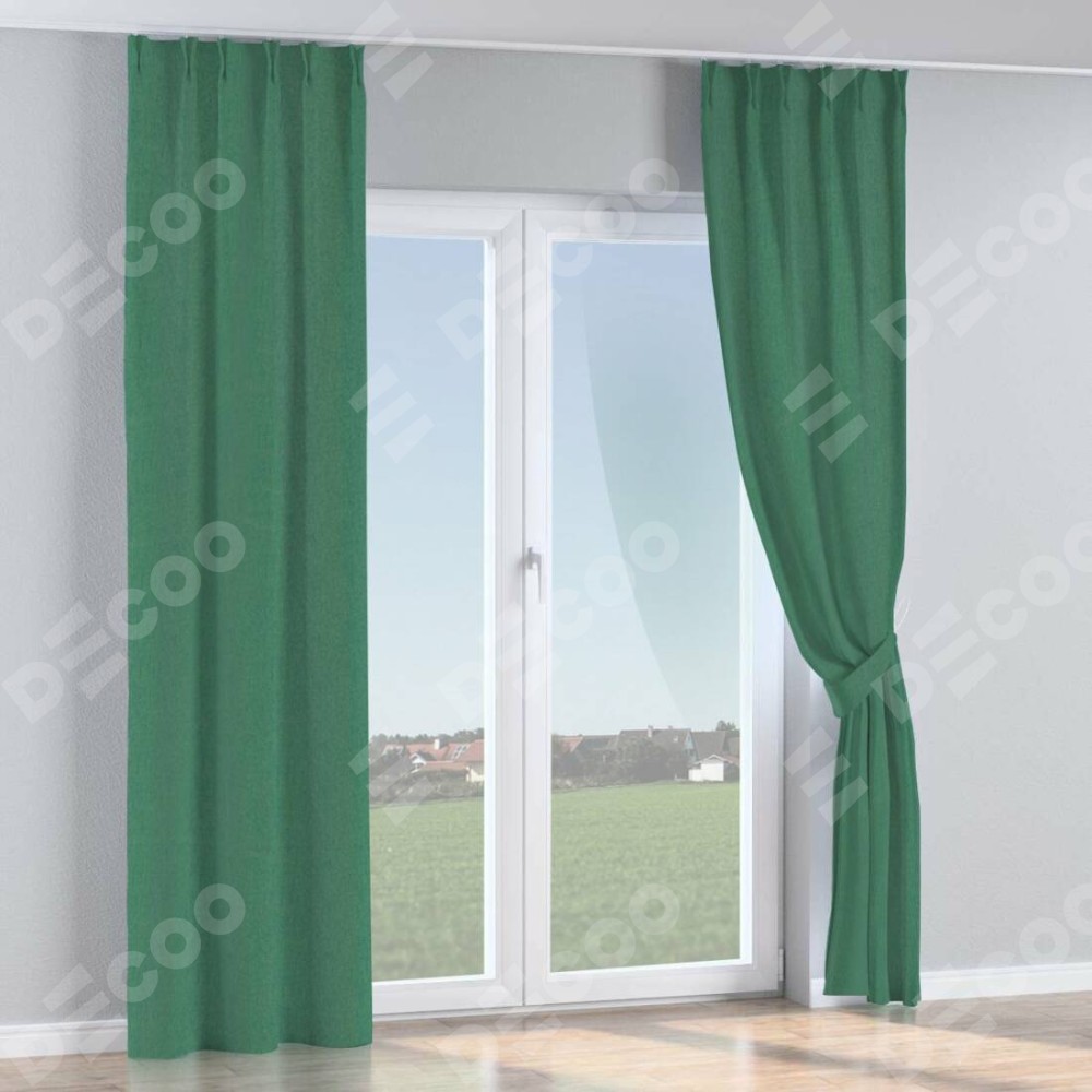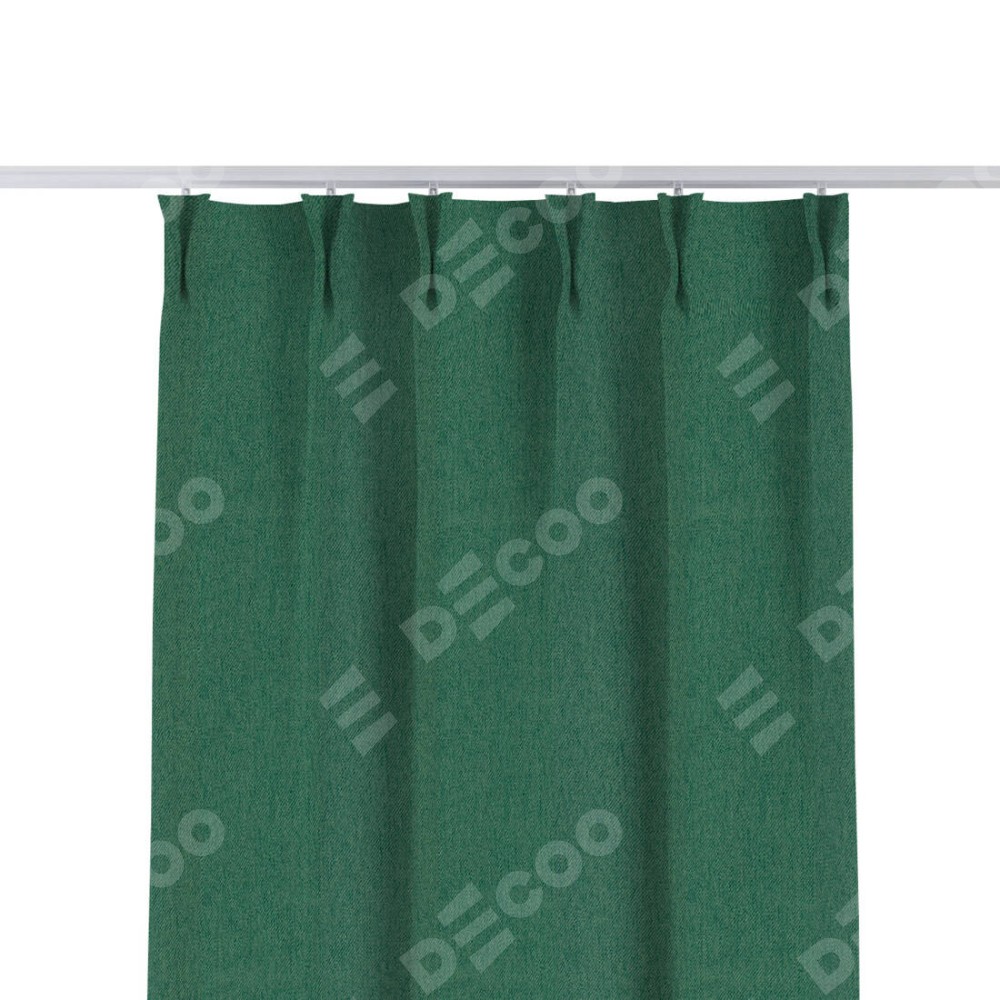 Комплект прямых штор, от производителя «Cortin», пошиты из ткани твид блэкаут зелёный, артикул ткани 21589. С изнаночной стороны в верхней части штор пристрачивается шторная лента с декоративными складками «Кустик». Для создания элегантных складок прямые шторы шьются по стандарту с коэффициентом 1:2 (на 100 см. ширины проёма 200 см. ширины ткани).