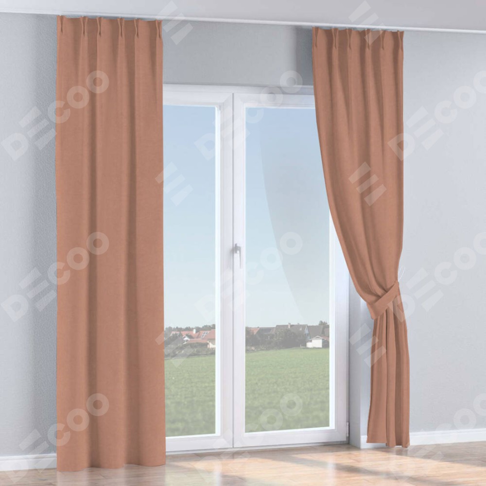 Комплект прямых штор, от производителя «Cortin», пошиты из ткани вельвет брусничный джем, артикул ткани 17750. С изнаночной стороны в верхней части штор пристрачивается шторная лента с декоративными складками «Кустик». Для создания элегантных складок прямые шторы шьются по стандарту с коэффициентом 1:2 (на 100 см. ширины проёма 200 см. ширины ткани).