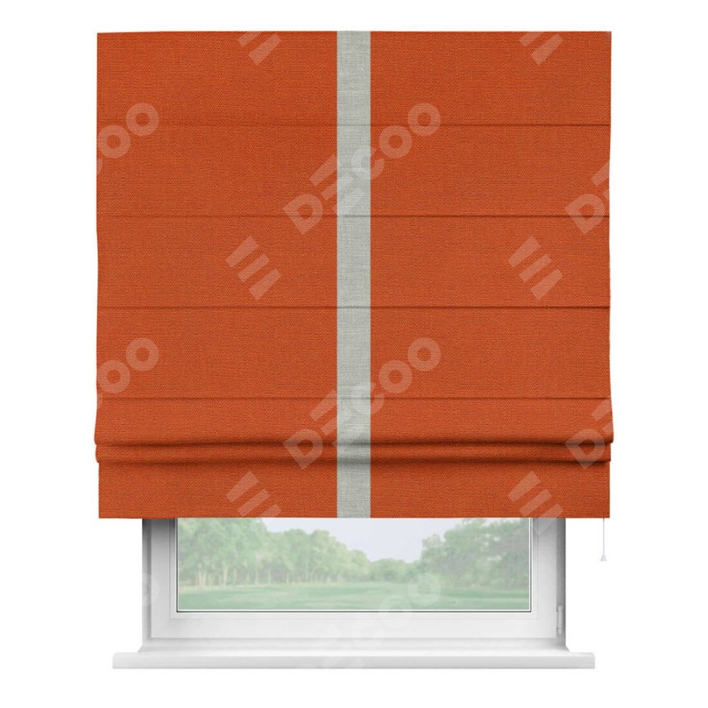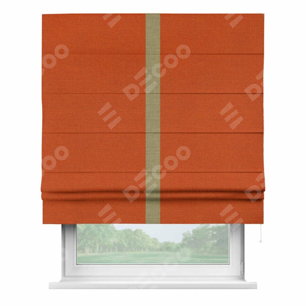 Римская штора производителя «Cortin», используется для проёма, пошита из ткани лён терракотовый, артикул 53440. Отделка шторы кантом «Хайвэй», ткань для канта используется из льна разной расцветки на выбор. Имеет универсальный механизм и подходит для монтажа: на потолок, на стену и в нишу.
