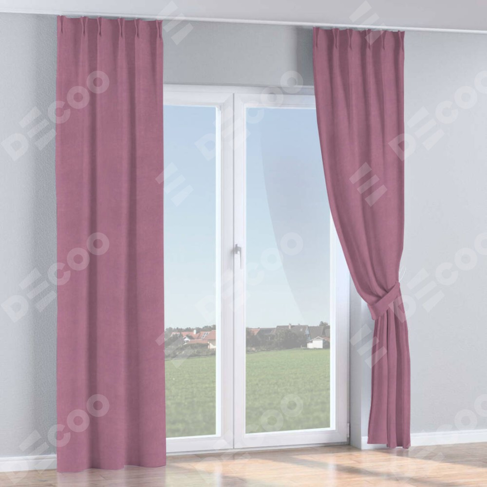 Комплект прямых штор, от производителя «Cortin», пошиты из ткани вельвет лиловый, артикул ткани 17752. С изнаночной стороны в верхней части штор пристрачивается шторная лента с декоративными складками «Кустик». Для создания элегантных складок прямые шторы шьются по стандарту с коэффициентом 1:2 (на 100 см. ширины проёма 200 см. ширины ткани).