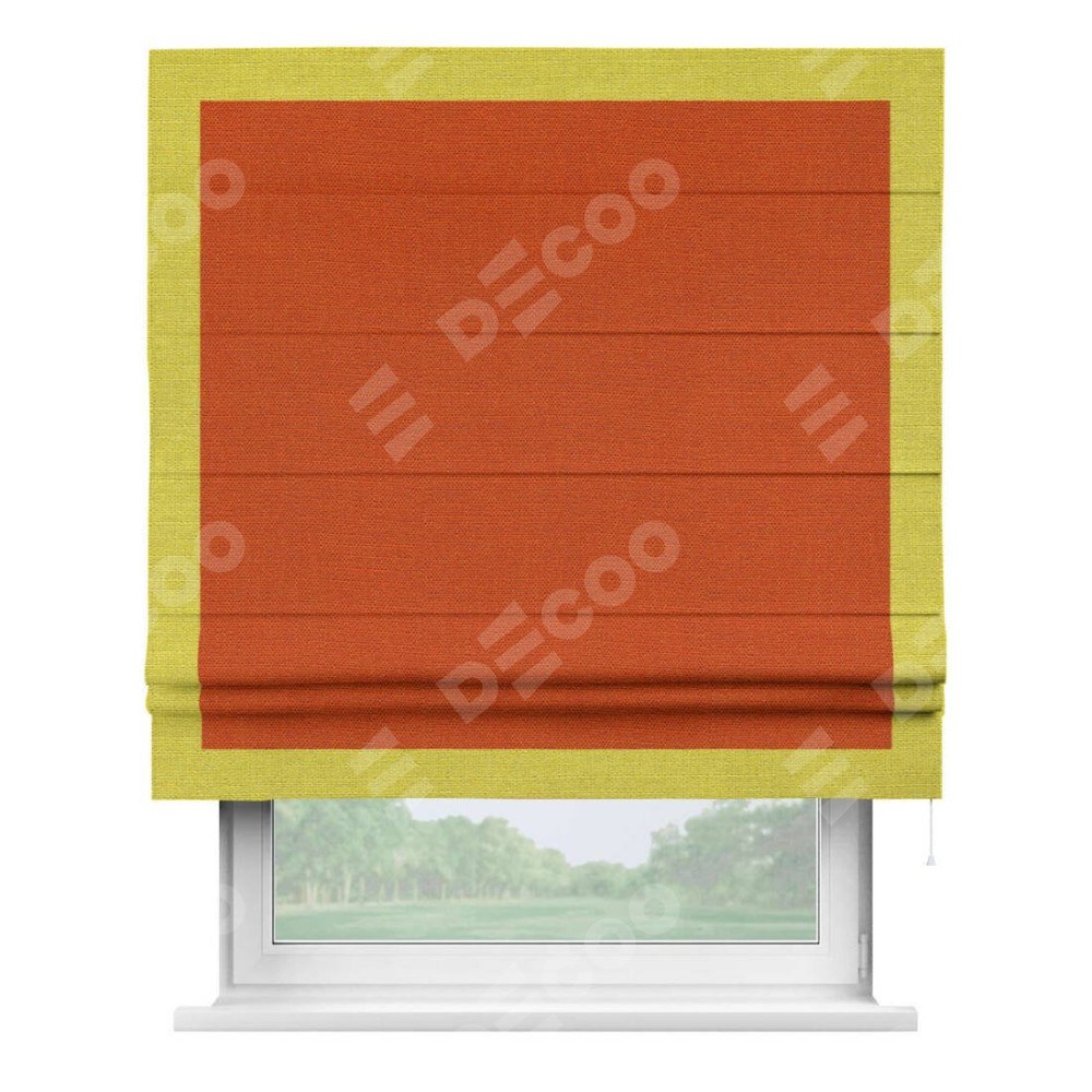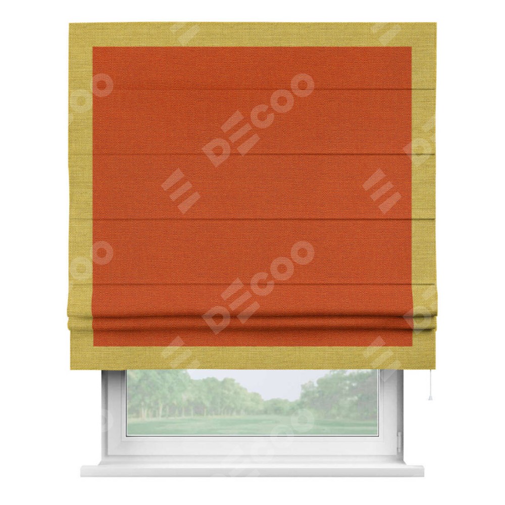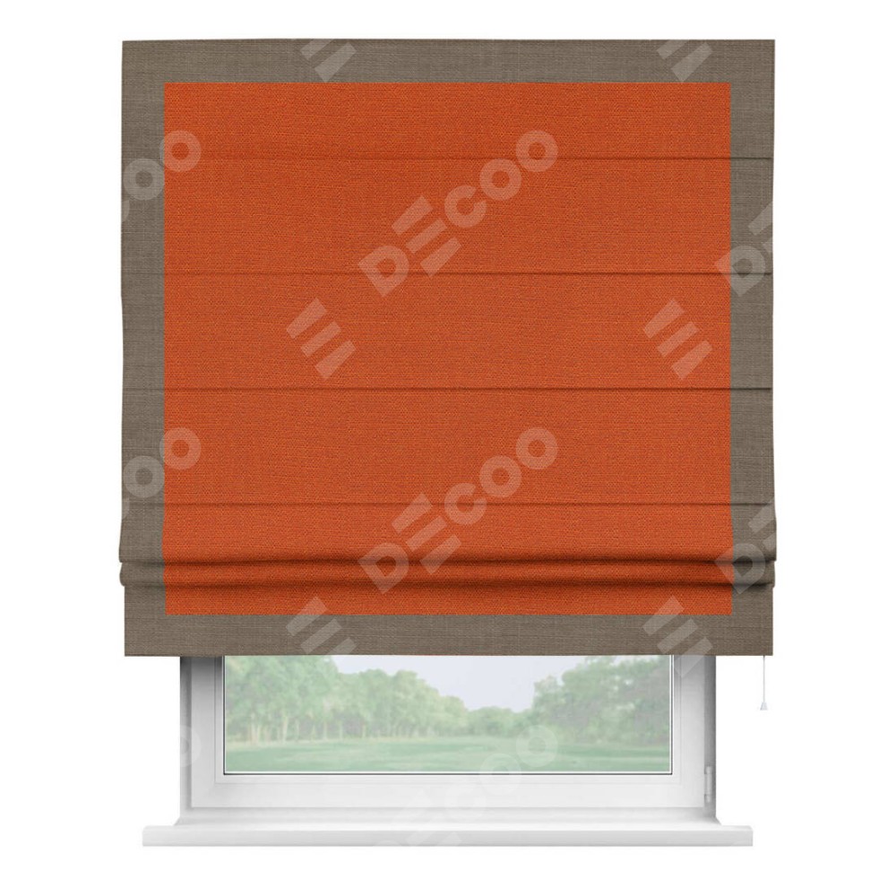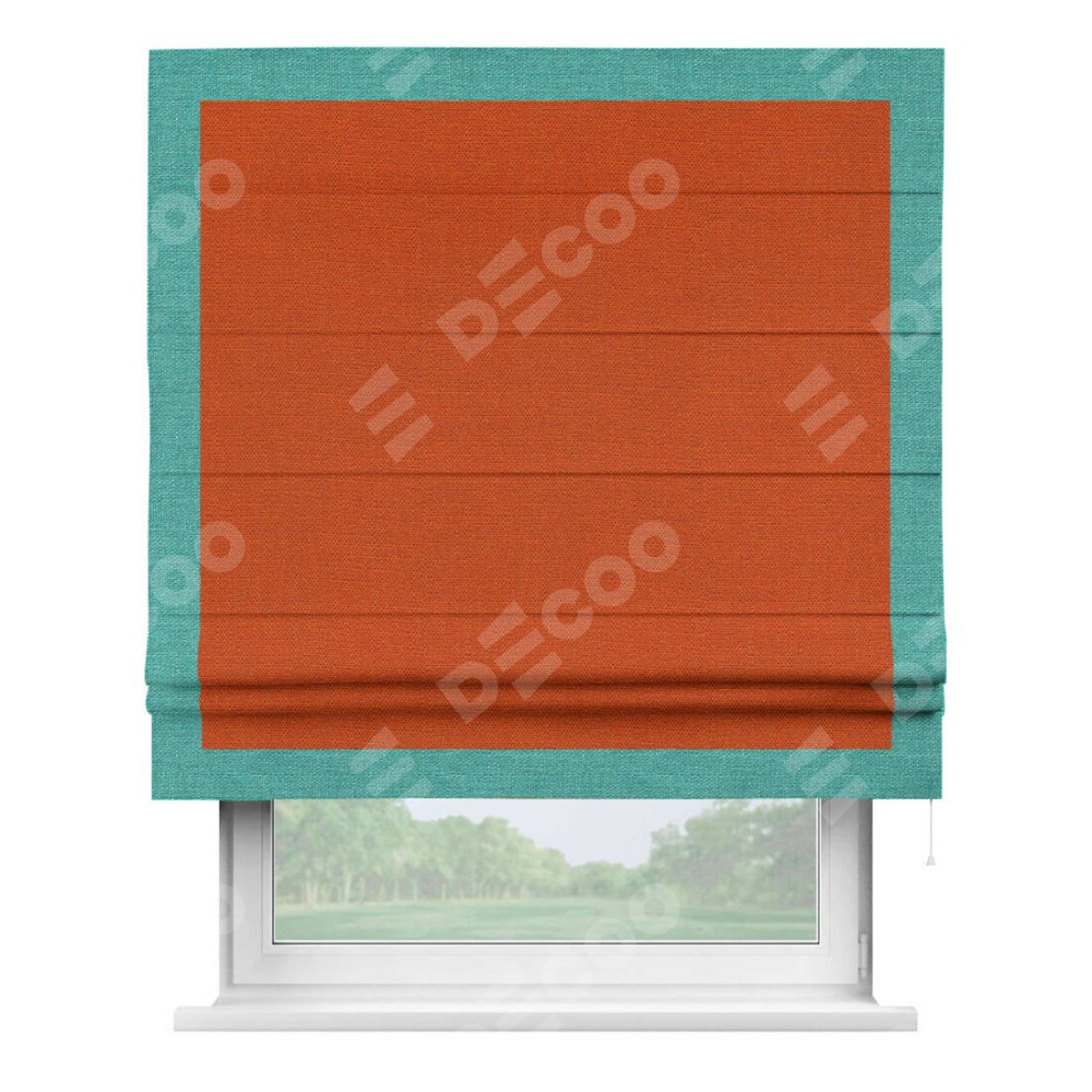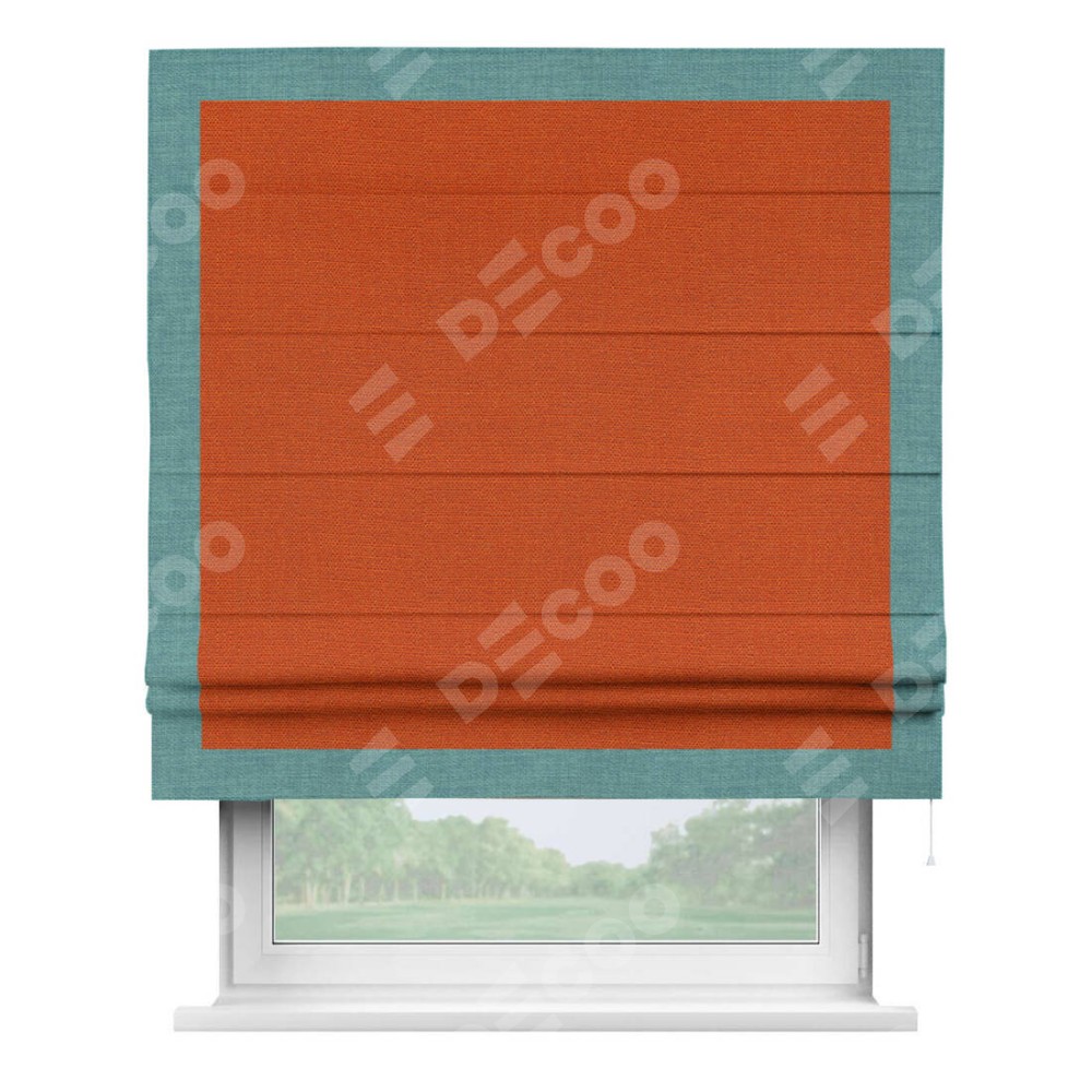 Римская штора производителя «Cortin», используется для проёма, пошита из ткани лён терракотовый, артикул 53440. Отделка шторы кантом «Чесс», ткань для канта используется из льна разной расцветки на выбор. Имеет универсальный механизм и подходит для монтажа: на потолок, на стену и в нишу.