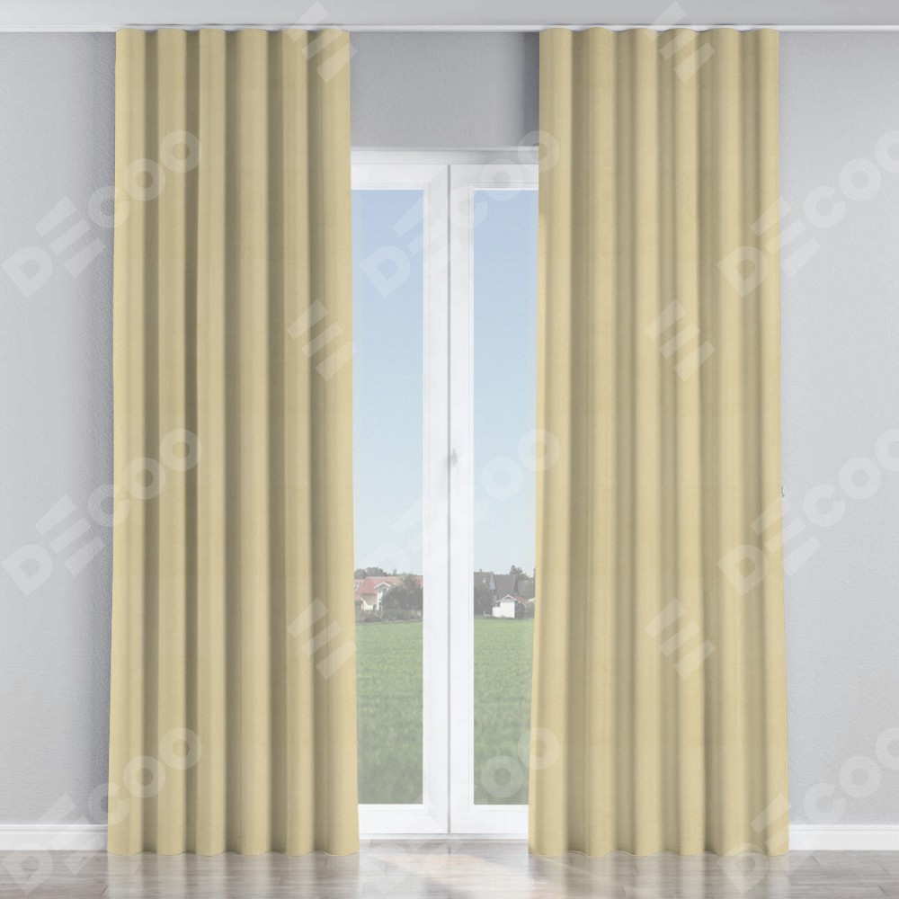 Комплект прямых штор, от производителя «Cortin», пошиты из ткани блэкаут однотонный милано латте, артикул ткани 05. С изнаночной стороны в верхней части штор пристрачивается шторная лента с декоративными складками «Волна». Для создания элегантных складок прямые шторы шьются по стандарту с коэффициентом 1:2 (на 100 см. ширины проёма 200 см. ширины ткани).