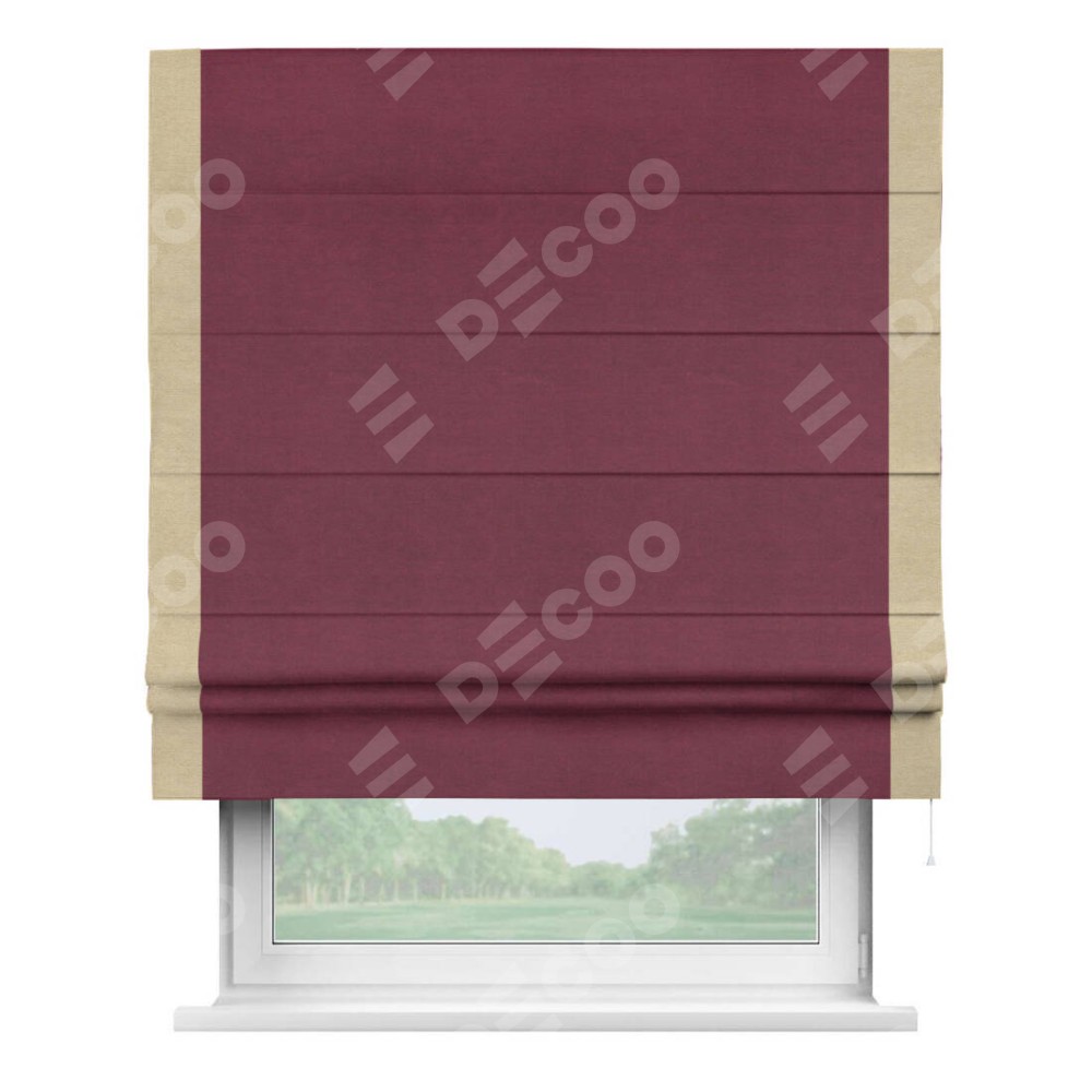 Римская штора производителя «Cortin», используется для проёма, пошита из ткани вельвет бордовый, артикул ткани 85553. Отделка шторы кантом «Стрим Дуо», ткань для канта используется из вельвета разной расцветки на выбор. Имеет универсальный механизм и подходит для монтажа: на потолок, на стену и в нишу.