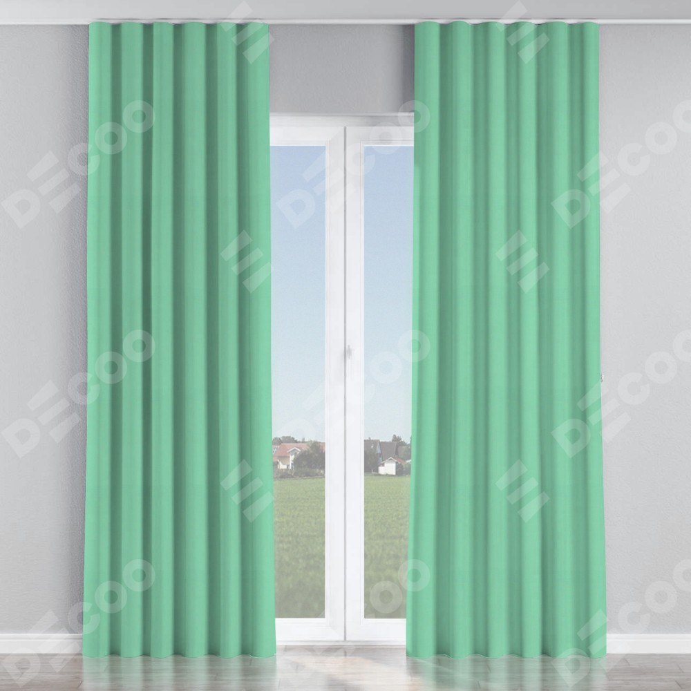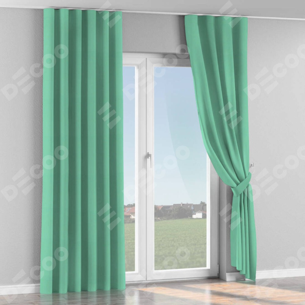 Комплект прямых штор, от производителя «Cortin», пошиты из ткани pipa блэкаут бирюза, артикул ткани 81852. С изнаночной стороны в верхней части штор пристрачивается шторная лента с декоративными складками «Волна». Для создания элегантных складок прямые шторы шьются по стандарту с коэффициентом 1:2 (на 100 см. ширины проёма 200 см. ширины ткани).
