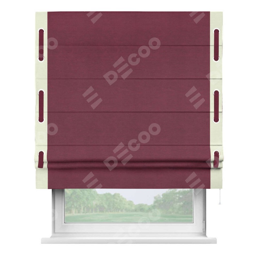 Римская штора производителя «Cortin», используется для проёма, пошита из ткани вельвет бордовый, артикул ткани 85553. Отделка шторы кантом «Стрим Дуо» на кантах расположены люверсы с пояском, ткань для канта используется из вельвета разной расцветки на выбор. Ткань для пояска обычно используется из основной ткани шторы, а так же можно сделать из любой расцветки по желанию. Имеет универсальный механизм и подходит для монтажа: на потолок, на стену и в нишу.