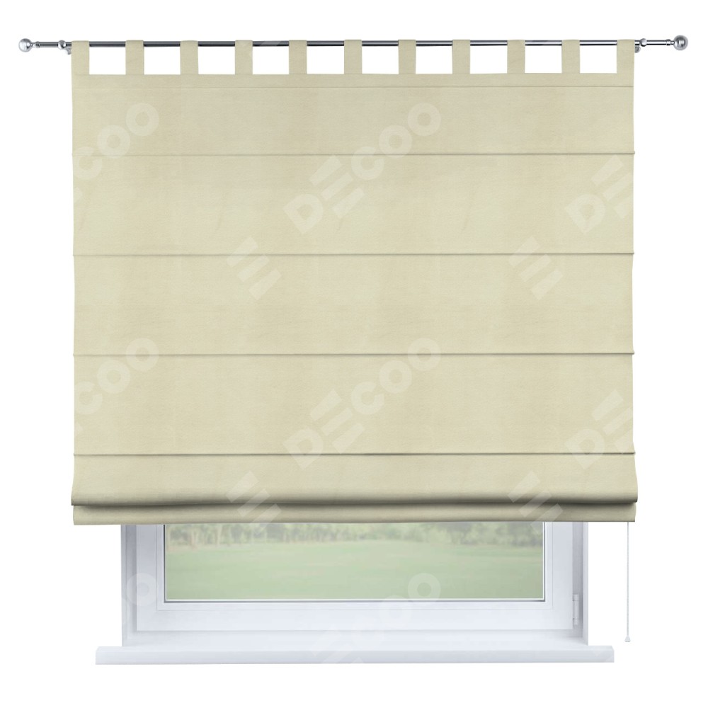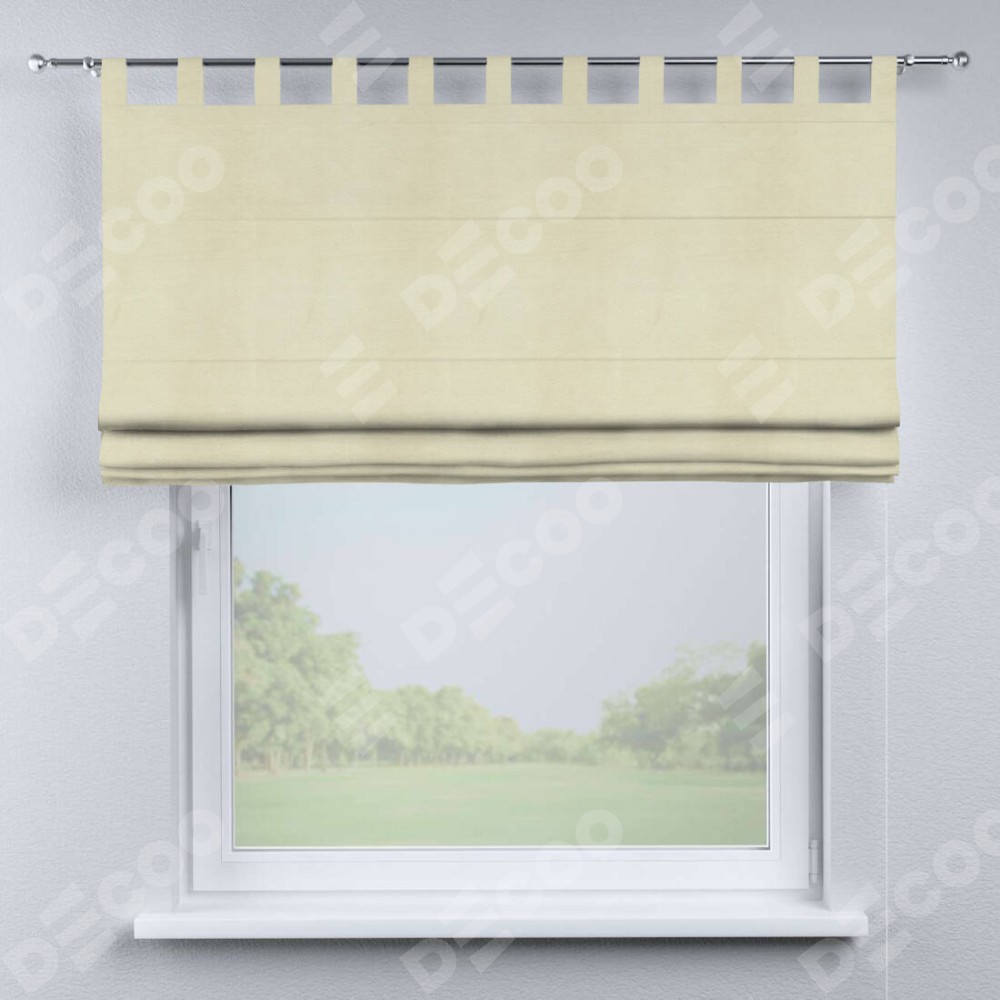 Римская штора производителя «Cortin», используется для проёма, пошита из ткани бархат молочный, артикул ткани 21409. Данная модель пошита на петлях, комплектуется на выбор круглым карнизом и подходит для монтажа на стену. Римская штора на петлях имеет простую систему регулировки высоты, отличительным преимуществом данной модели является простой способ монтажа. Достаточно повесить ее на трубу и штора готова!