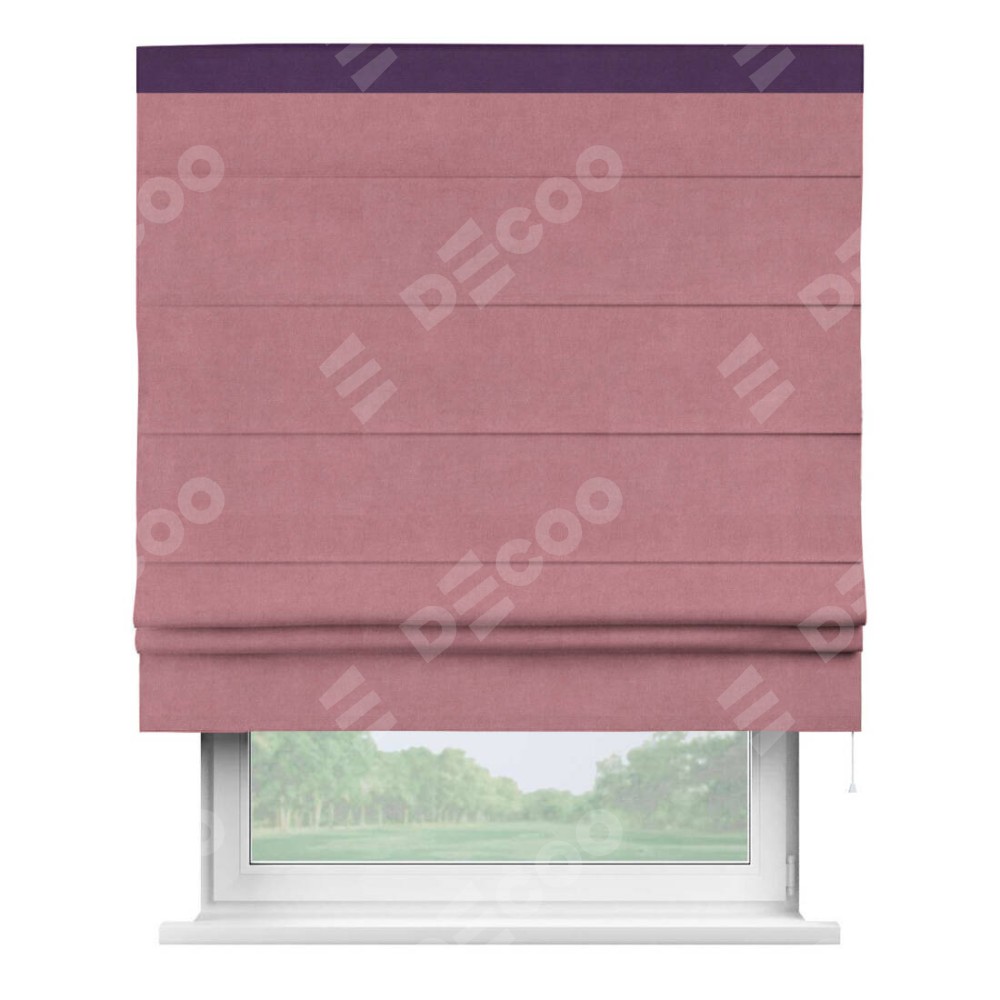 Римская штора производителя «Cortin», используется для проёма, пошита из ткани вельвет брусника, артикул ткани 85550. Отделка шторы кантом «Кинг», ткань для канта используется из вельвета разной расцветки на выбор. Имеет универсальный механизм и подходит для монтажа: на потолок, на стену и в нишу.