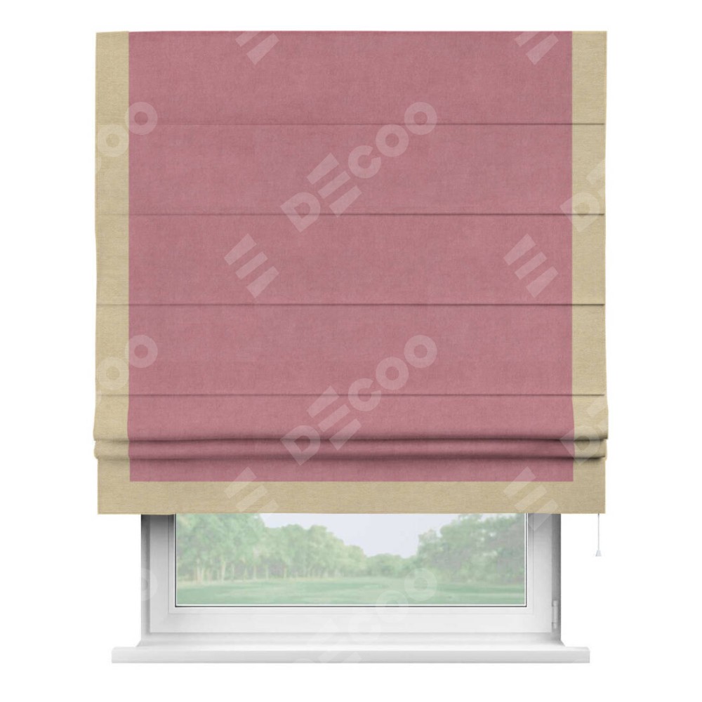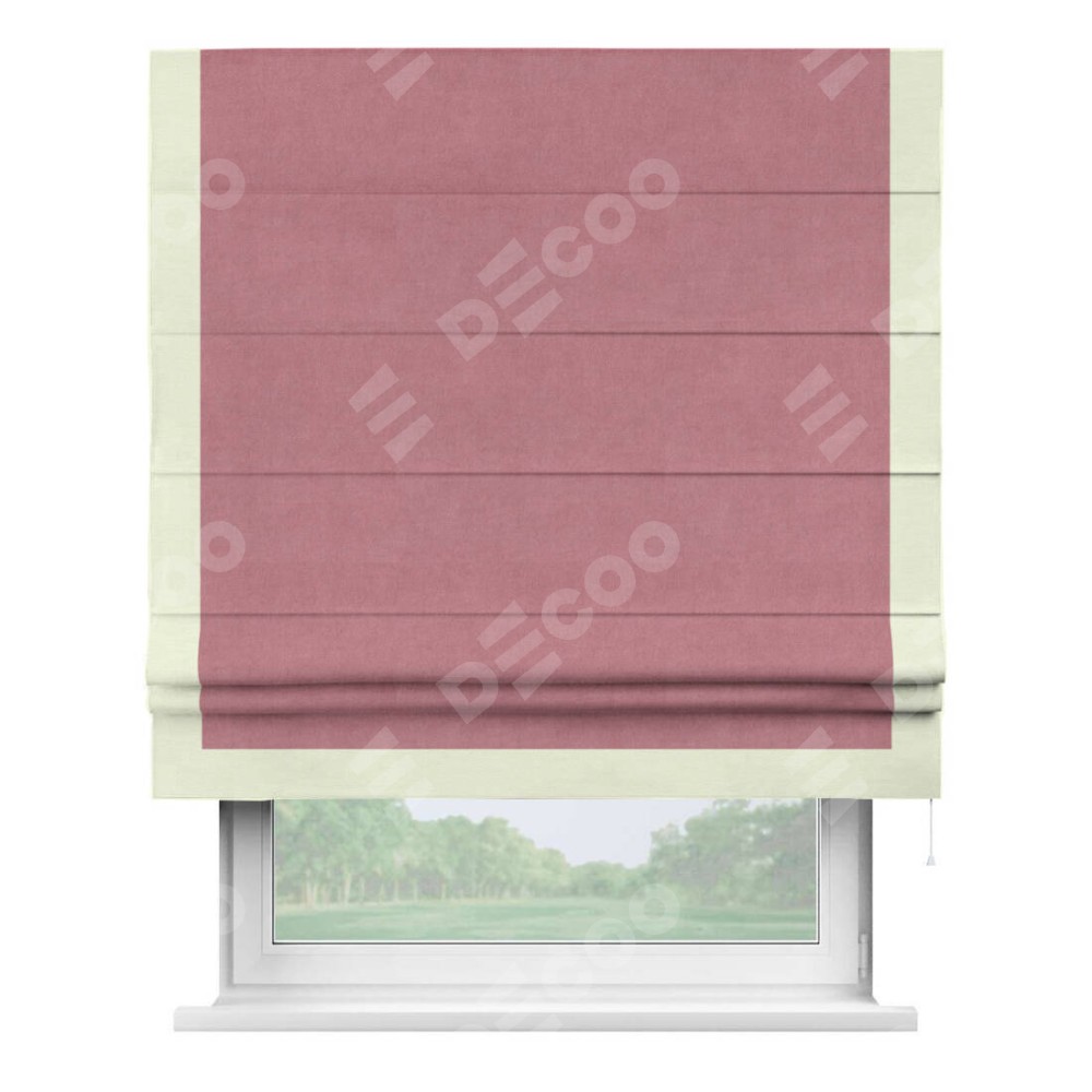 Римская штора производителя «Cortin», используется для проёма, пошита из ткани вельвет брусника, артикул ткани 85550. Отделка шторы кантом «Виктория», ткань для канта используется из вельвета разной расцветки на выбор. Имеет универсальный механизм и подходит для монтажа: на потолок, на стену и в нишу.