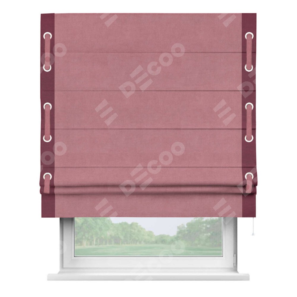 Римская штора производителя «Cortin», используется для проёма, пошита из ткани вельвет брусника, артикул ткани 85550. Отделка шторы кантом «Стрим Дуо» на кантах расположены люверсы с пояском, ткань для канта используется из вельвета разной расцветки на выбор. Ткань для пояска обычно используется из основной ткани шторы, а так же можно сделать из любой расцветки по желанию. Имеет универсальный механизм и подходит для монтажа: на потолок, на стену и в нишу.