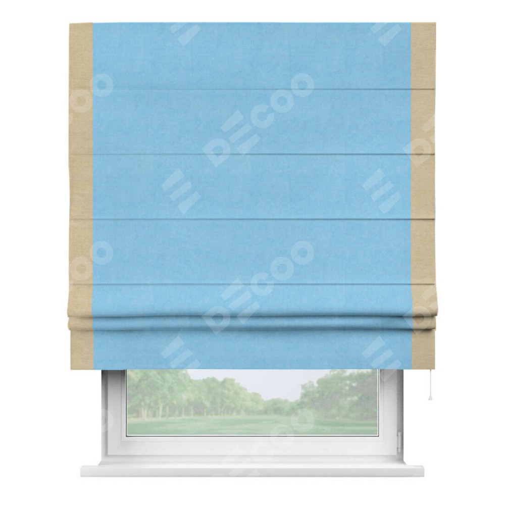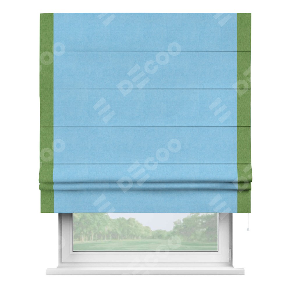 Римская штора производителя «Cortin», используется для проёма, пошита из ткани вельвет голубой, артикул ткани 85544. Отделка шторы кантом «Стрим Дуо», ткань для канта используется из вельвета разной расцветки на выбор. Имеет универсальный механизм и подходит для монтажа: на потолок, на стену и в нишу.
