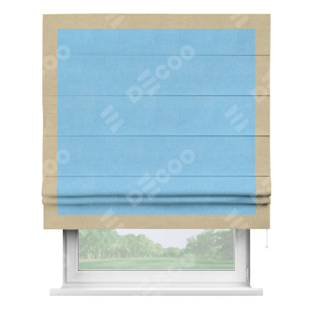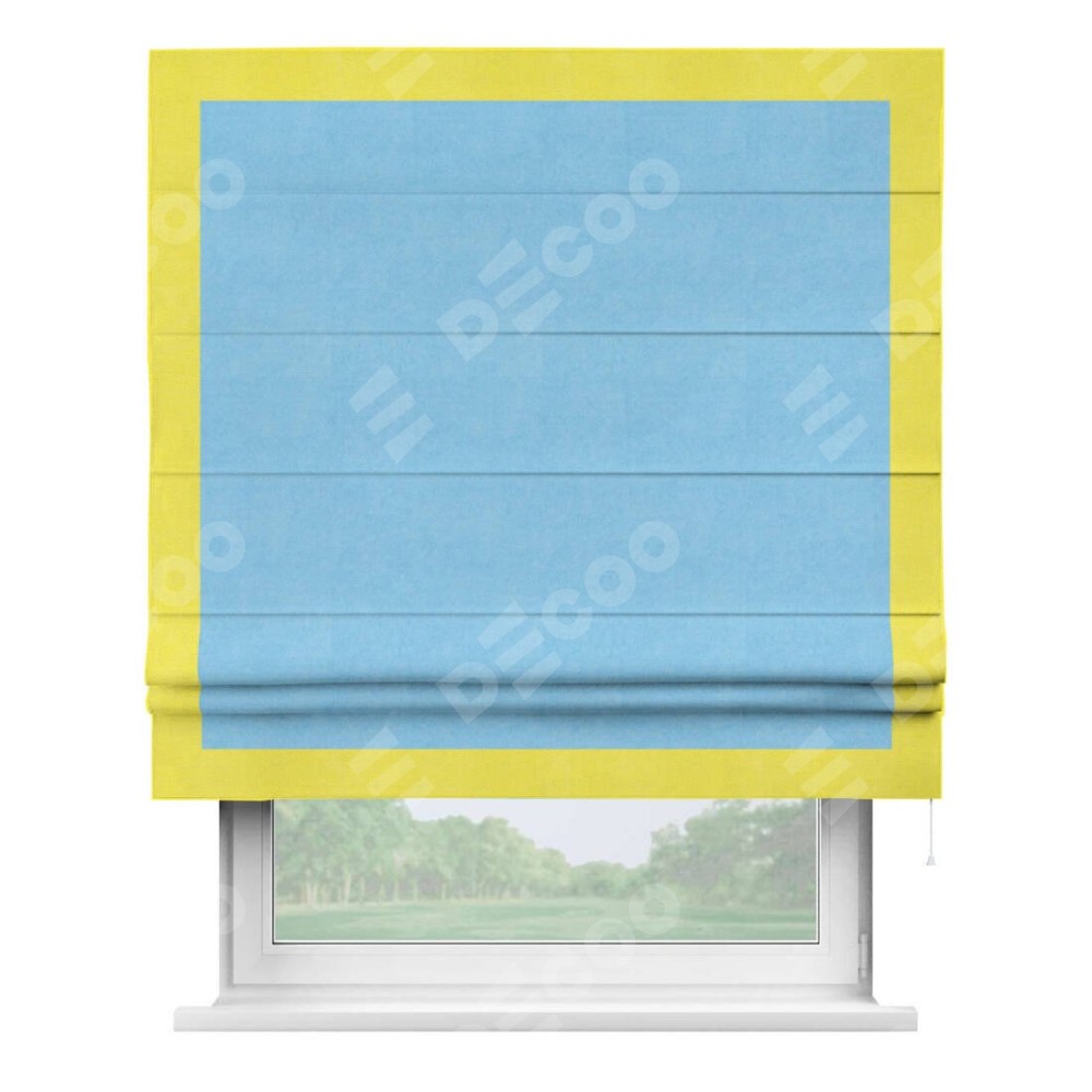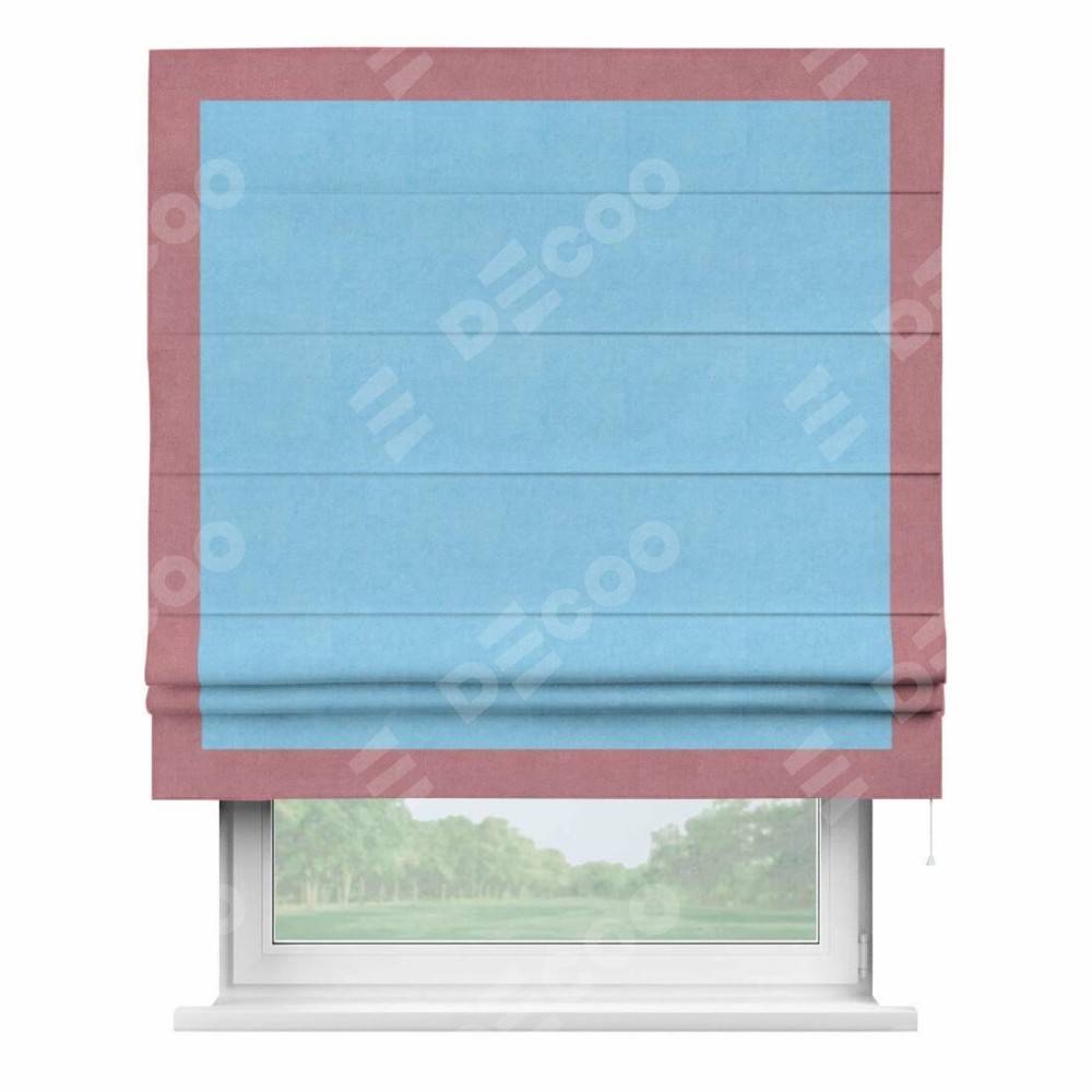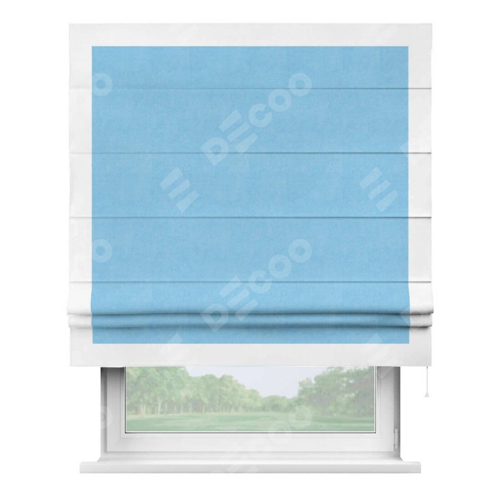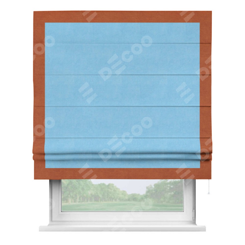 Римская штора производителя «Cortin», используется для проёма, пошита из ткани вельвет голубой, артикул ткани 85544. Отделка шторы кантом «Чесс», ткань для канта используется из вельвета разной расцветки на выбор. Имеет универсальный механизм и подходит для монтажа: на потолок, на стену и в нишу.