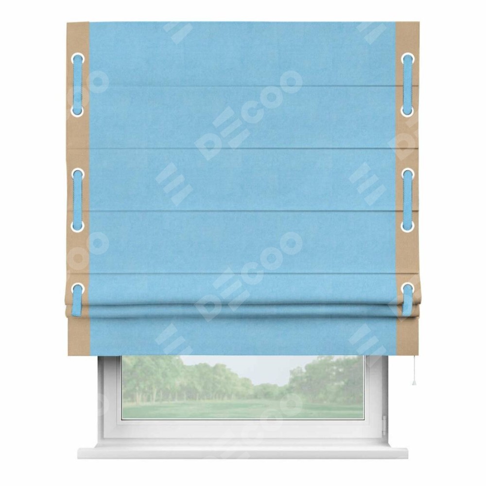 Римская штора производителя «Cortin», используется для проёма, пошита из ткани вельвет голубой, артикул ткани 85544. Отделка шторы кантом «Стрим Дуо» на кантах расположены люверсы с пояском, ткань для канта используется из вельвета разной расцветки на выбор. Ткань для пояска обычно используется из основной ткани шторы, а так же можно сделать из любой расцветки по желанию. Имеет универсальный механизм и подходит для монтажа: на потолок, на стену и в нишу.