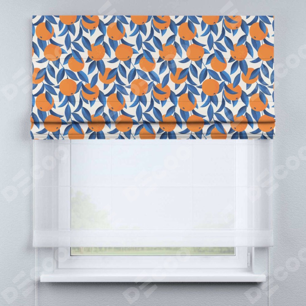 Римская штора день-ночь производителя «Cortin», используется для проёма, пошита из двух полотен, с лицевой блэкаут с нанесением сублимационной печати «Апельсиновое настроение», вторая ткань тюль (по стандарту комплектуется тюль белого цвета артикул V-01). Имеет универсальный механизм и подходит для монтажа: на потолок, на стену и в нишу.