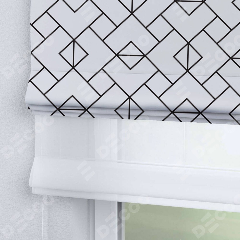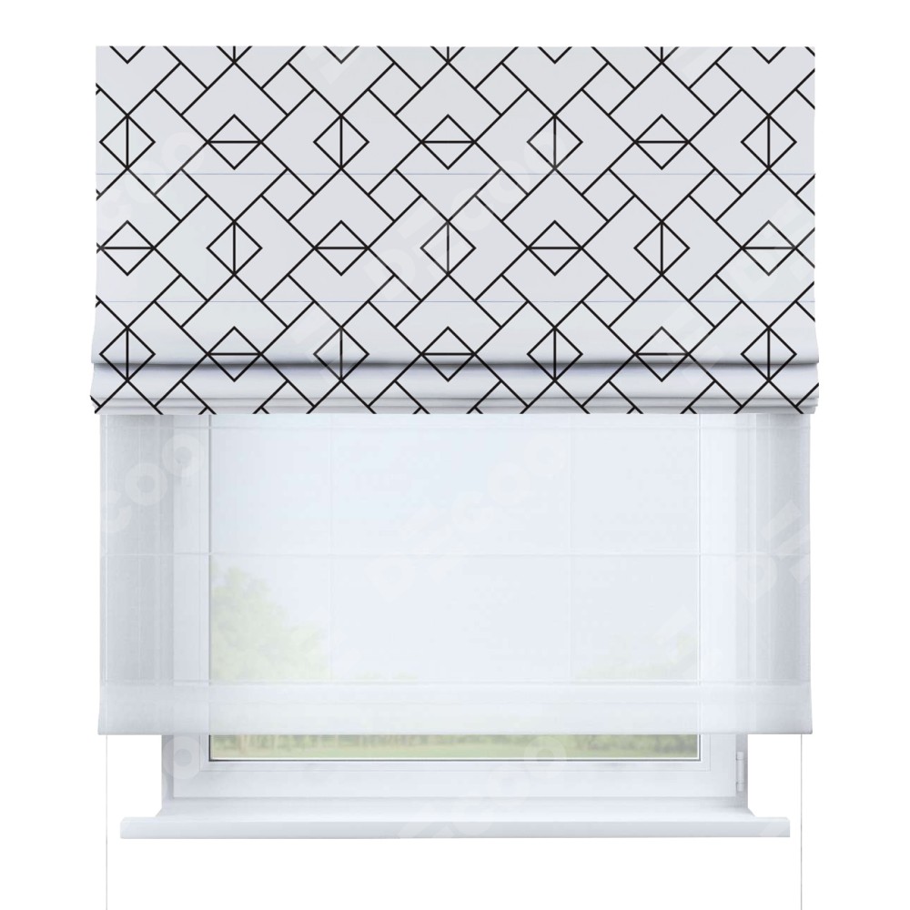 Римская штора день-ночь производителя «Cortin», используется для проёма, пошита из двух полотен, с лицевой блэкаут с нанесением сублимационной печати «Геометрический орнамент», вторая ткань тюль (по стандарту комплектуется тюль белого цвета артикул V-01). Имеет универсальный механизм и подходит для монтажа: на потолок, на стену и в нишу.
