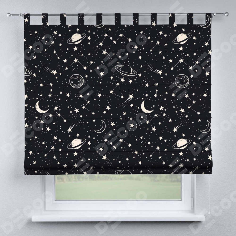Римская штора производителя «Cortin», используется для проёма, пошита из ткани блэкаут с нанесением сублимационной печати «Глубокий космос». Данная модель пошита на петлях, комплектуется на выбор круглым карнизом и подходит для монтажа на стену. Римская штора на петлях имеет простую систему регулировки высоты, отличительным преимуществом данной модели является простой способ монтажа. Достаточно повесить ее на трубу и штора готова!