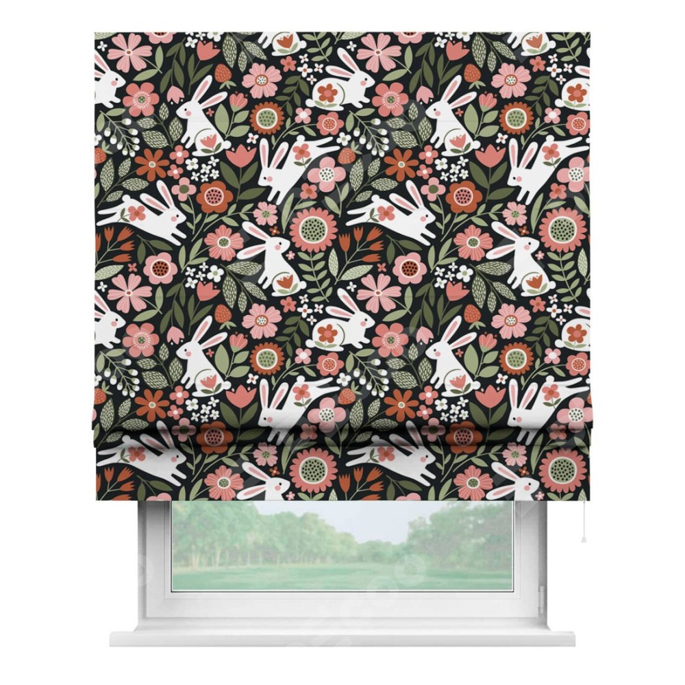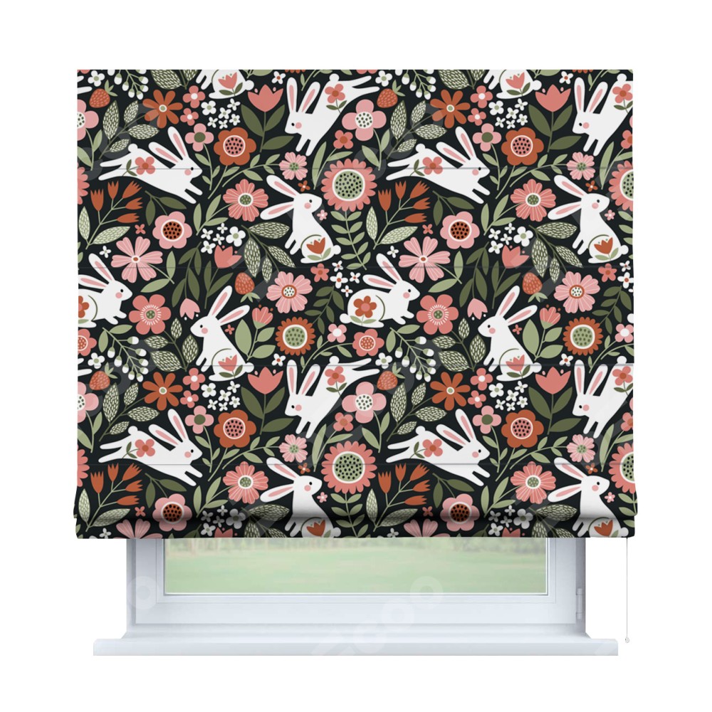 Римская штора производителя «Cortin», используется для проёма, пошита из ткани блэкаут с нанесением сублимационной печати «Зайчики в цветнике». Имеет универсальный механизм и подходит для монтажа: на потолок, на стену и в нишу.
